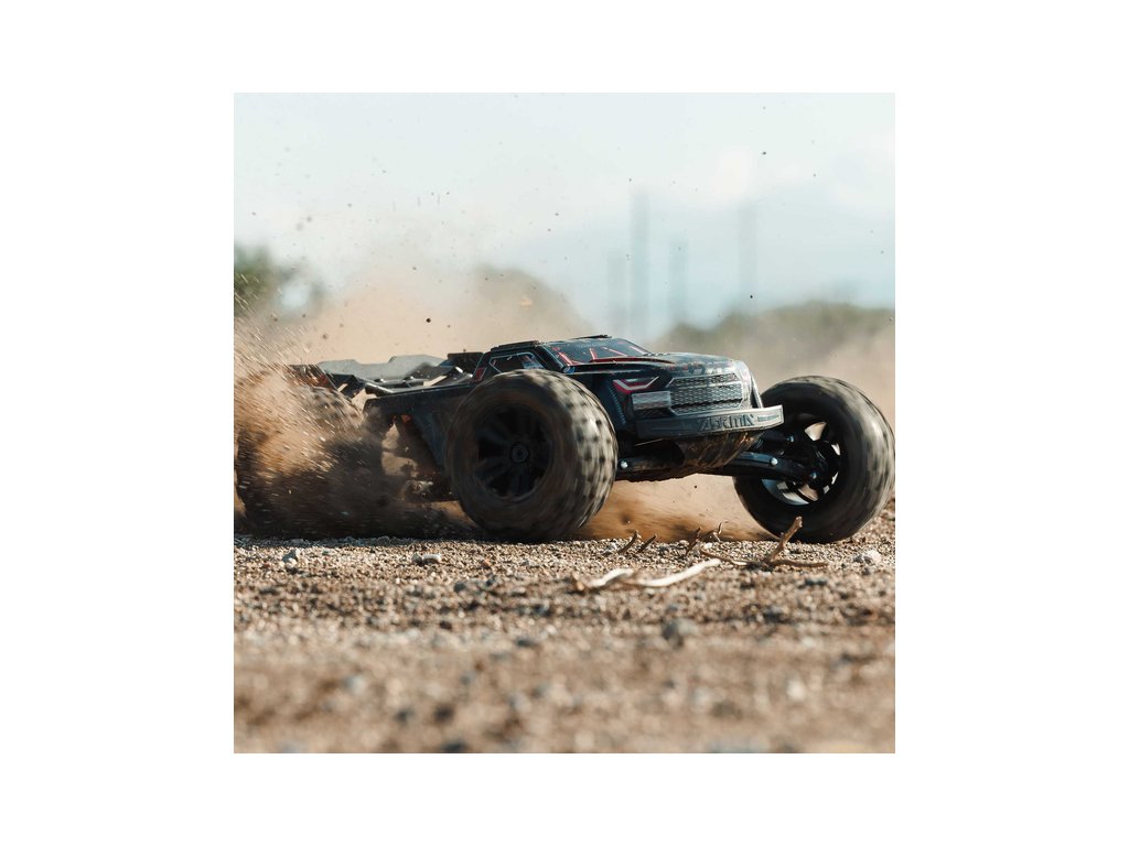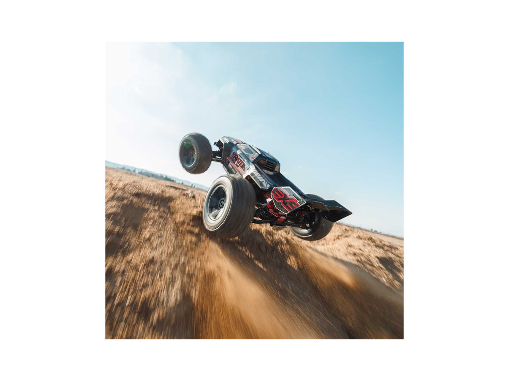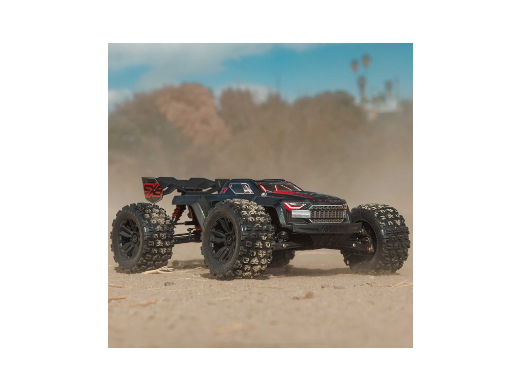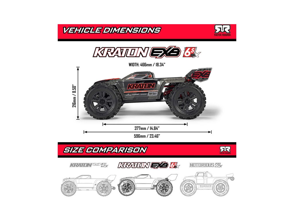 Verze V6 legendárního RC modelu auta Arrma Kraton 6S BLX v měřítku 1:8 a ve vrcholném provedení Extreme Bash se spoustou vysoce odolných dílů z pevnostního hliníku, která posouvá svou impozantní rychlost a sílu na další úroveň a přidává klíčová vylepšení pro odolnost. Extra výkonný střídavý motor umožňuje rychlost modelu až 104 km/h. Nainstalována je kompletní elektronika s novým regulátorem Spektrum Firma V2, servo s kovovými převody a přijímač. Výborné jízdní vlastnosti na asfaltu i v terénu zaručuje nezávislé zavěšení s širokým rozchodem kol a vyladěný náhon 4x4 s diferenciály. Karoserie je bezsponková pro rychlou a snadnou montáž a demontáž a pro čistý vzhled bez klipů.