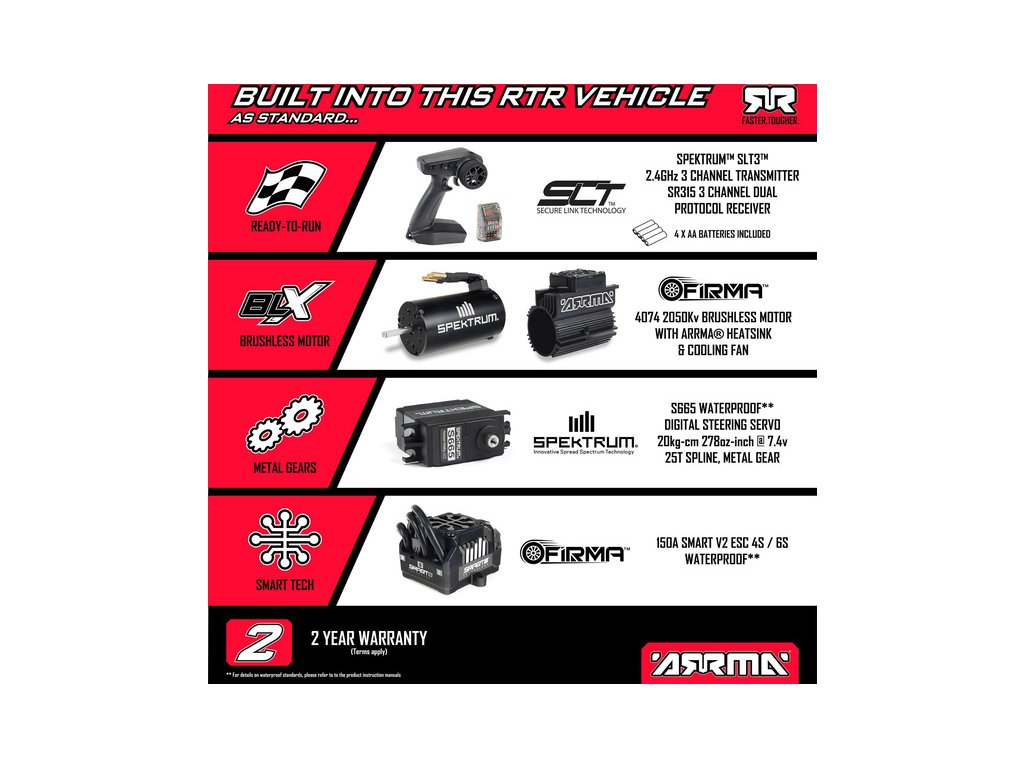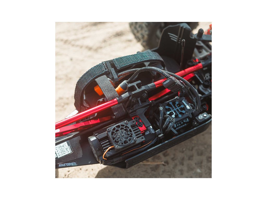 Podvozek, diferenciály, přední nárazník, kluzné desky podvozku a dokonce i uchycení křídla to všechno bylo vylepšeno a zesíleno pro větší pevnost. Nové boční ochranné kryty zamezují vnikání nečistot, dvoudílná vzpěra mezi věžemi přidává tuhost podvozku a zjednodušuje údržbu. Použitá elektronika je voděodolná* a nemusíte se bát jízdy v mokrém prostředí. Regulátor V2 má upravený firmware pro ještě vyšší výkon a rychlejší odezvu. Přesné a jisté řízení zajišťuje digitální servo s kovovými převody.