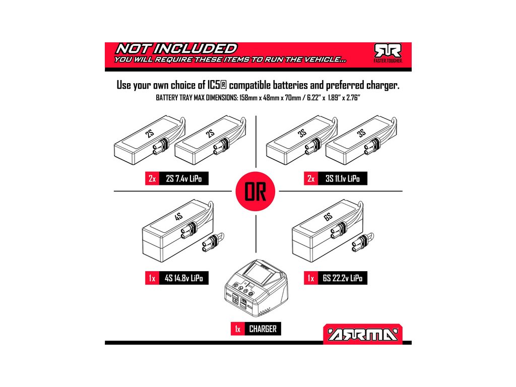 - Pro maximální možnou rychlost doporučujeme dvojici tříčlánkových akumulátorů Spektrum 11.1 V 5000 mAh s technologií Smart, nebo Spektrum G2 11.1 V 5000 mAh s technologií Smart G2, nebo extra výkonné Spektrum G2 11.1 V 6800 mAh s technologií Smart G2.