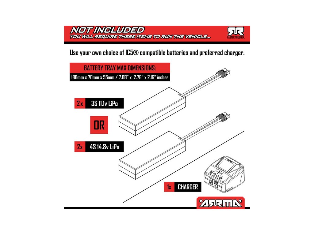 - Pro běžné ježdění LiPo akumulátory Spektrum 11.1 V 5000 mAh s technologií Smart, nebo Spektrum G2 11.1 V 5000 mAh s technologií Smart G2.