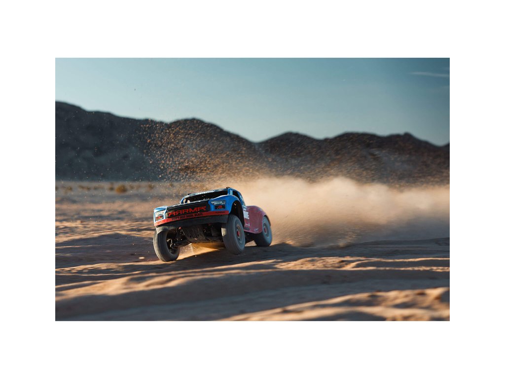 RC model pouštního závodního vozu - Arrma Mojave 4S BLX 1:8 RTR se střídavým motorem, jede rychlostí až 80 km/h. Odolné kompozitní šasi, pohonné ústrojí nově se středovým diferenciálem, detailní karoserie, hliníkové komponenty, olejové tlumiče. Špičková elektronika Spektrum.