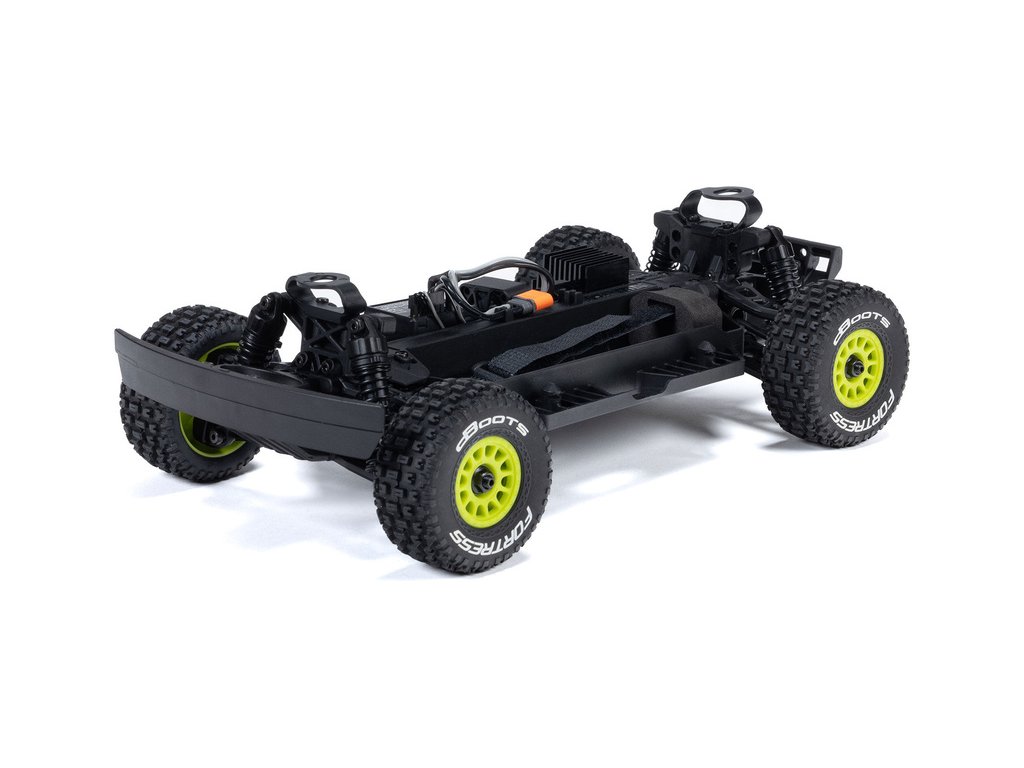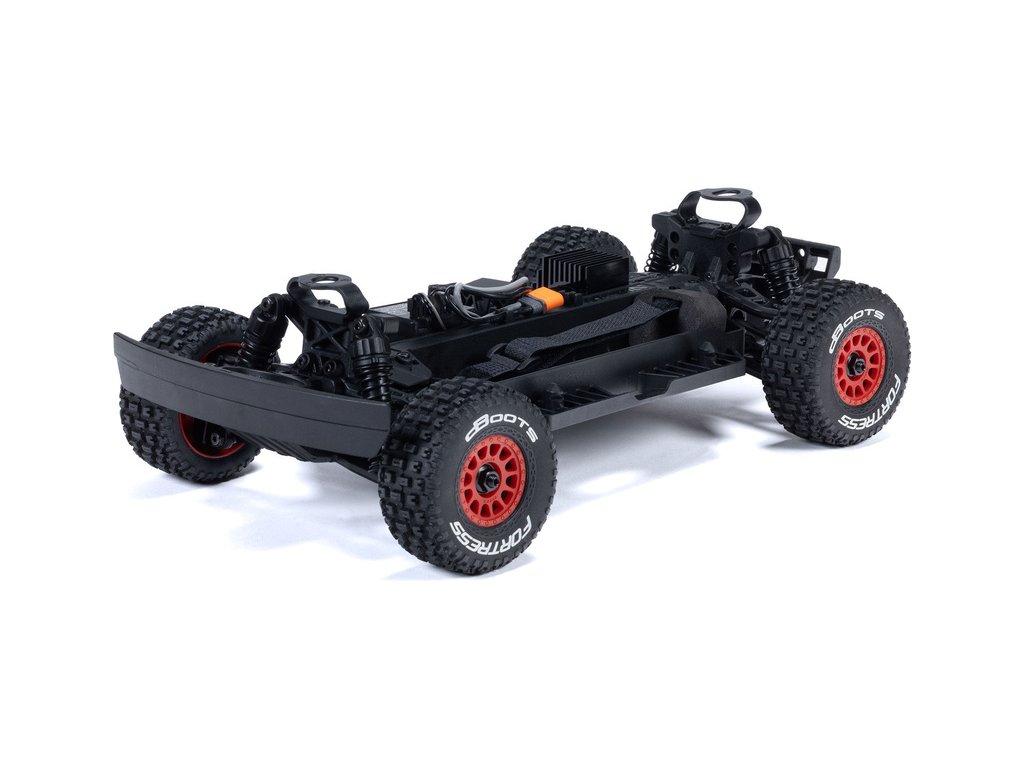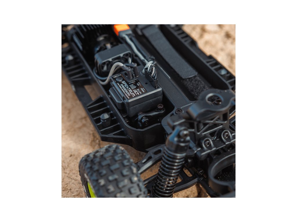 Auto je pro náročnou jízdu skvěle připraveno, obsahuje silné kompozitní šasi s nezávislým zavěšením, olejovými tlumiči a náhonem 4WD. Robustní kovové převody diferenciálů přenáší výkon ze stejnosměrného motoru MEGA 380 přes uzavřené hnací ústrojí až na kola a pneumatiky dBoots Fortress. Dokonce i servo řízení Spektrum™ SX110 má kovové převody a stejně jako přijímač/regulátor Spektrum SLT™ 2-v-1 25A, vybavený konektorem IC2®, je voděodolné* pro jízdu v mokrém prostředí. Integrovaný vysokorychlostní chladicí ventilátor udržuje nízké teploty motoru a regulátoru pro dlouhou životnost a špičkový výkon.