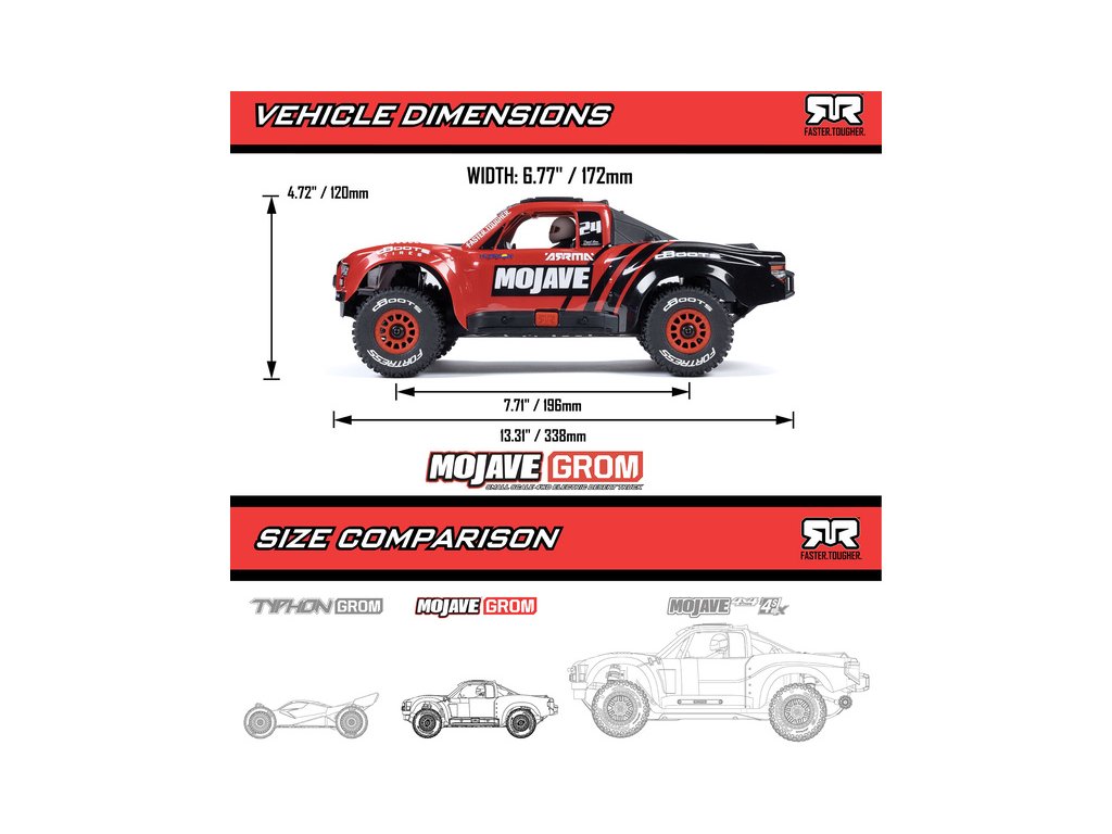 ARRMA MOJAVE GROM 4X4 1:16 RTR je navržen a vyroben podle stejně vysokých standardů, odolnosti a výkonů, jaké očekáváte od RC aut ARRMA. Je jen o něco menší!