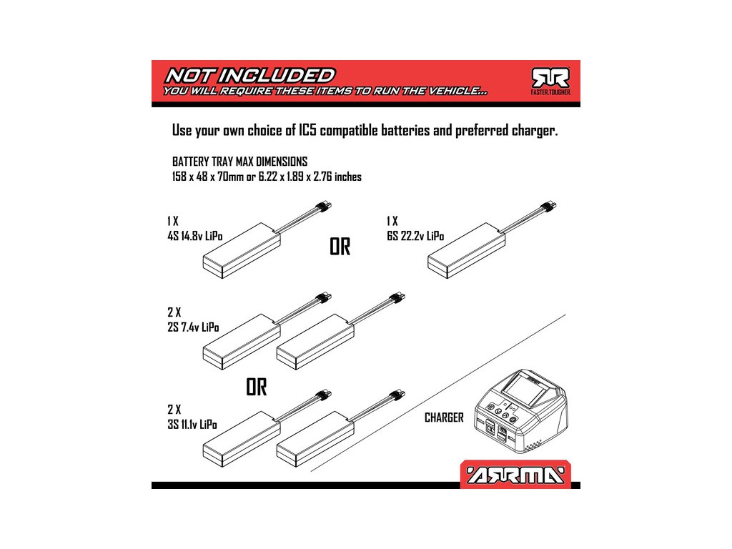- Pro maximální možnou rychlost doporučujeme dvojici tříčlánkových akumulátorů Spektrum 11.1 V 5000 mAh s technologií Smart, nebo Spektrum G2 11.1 V 5000 mAh s technologií Smart G2, nebo extra výkonné Spektrum G2 11.1 V 6800 mAh s technologií Smart G2.