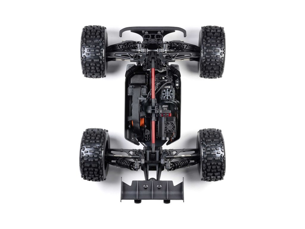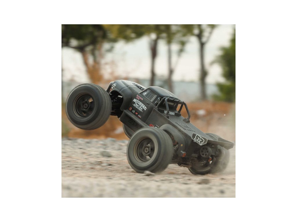 RC model auta Arrma Notorious 6S BLX 1:8 s náhonem 4WD a krátkým rozvorem pro kaskadérské kousky, je vybaven střídavý motorem, pro rychlost až 96 km/h! Regulátor Spektrum s podporou telemetrie a funkcemi Smart. Hliníkové šasi a další díly EXB pro maximální odolnost. Vysílač Spektrum SLT3.