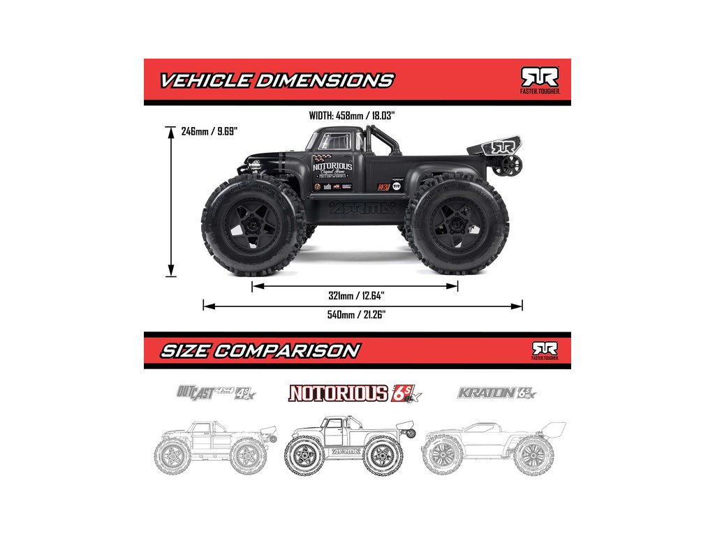 Nová verze V6 RC modelu auta Arrma Notorious 6S BLX v měřítku 1:8, která posouvá svou impozantní rychlost a sílu na další úroveň a přidává klíčová vylepšení pro odolnost. Díky tomu můžete provádět ještě lepší a odvážnější kaskadérské kousky, model je díky krátkému rozvoru pro to jako stvořený. Instalovány jsou vysoce pevnostní díly EXB (Extreme Bash), pro nespoutanou jízdu. Extra výkonný střídavý motor umožňuje rychlost model až 96 km/h. Nainstalována je kompletní elektronika s novým regulátorem Spektrum Firma V2, servo s kovovými převody a přijímač. Výborné jízdní vlastnosti na asfaltu i v terénu zaručuje nezávislé zavěšení a vyladěný náhon 4x4 s diferenciály. Karoserie, s retro vzhledem inspirovaným letadly z 2. světové války, je bezsponková pro rychlou a snadnou montáž a demontáž a pro čisté linie bez klipů.