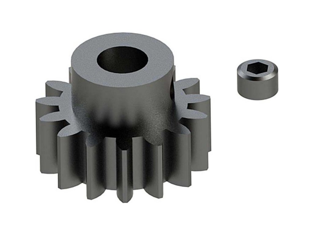 Arrma pastorek na hřídel 5 mm s 15 zuby a modulem ozubení 1 mm pro RC modely aut. Vyrobeno z sintrované oceli. Součástí balení je červík.
