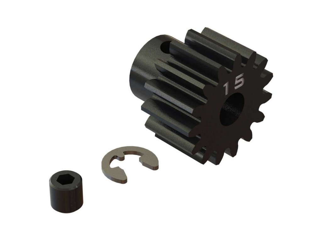 Arrma pastorek na hřídel 5 mm s 15 zuby a modulem ozubení 1 mm pro RC model auta Arrma Kraton 8S BLX. Vyrobeno z sintrované oceli. Součástí balení je červík.