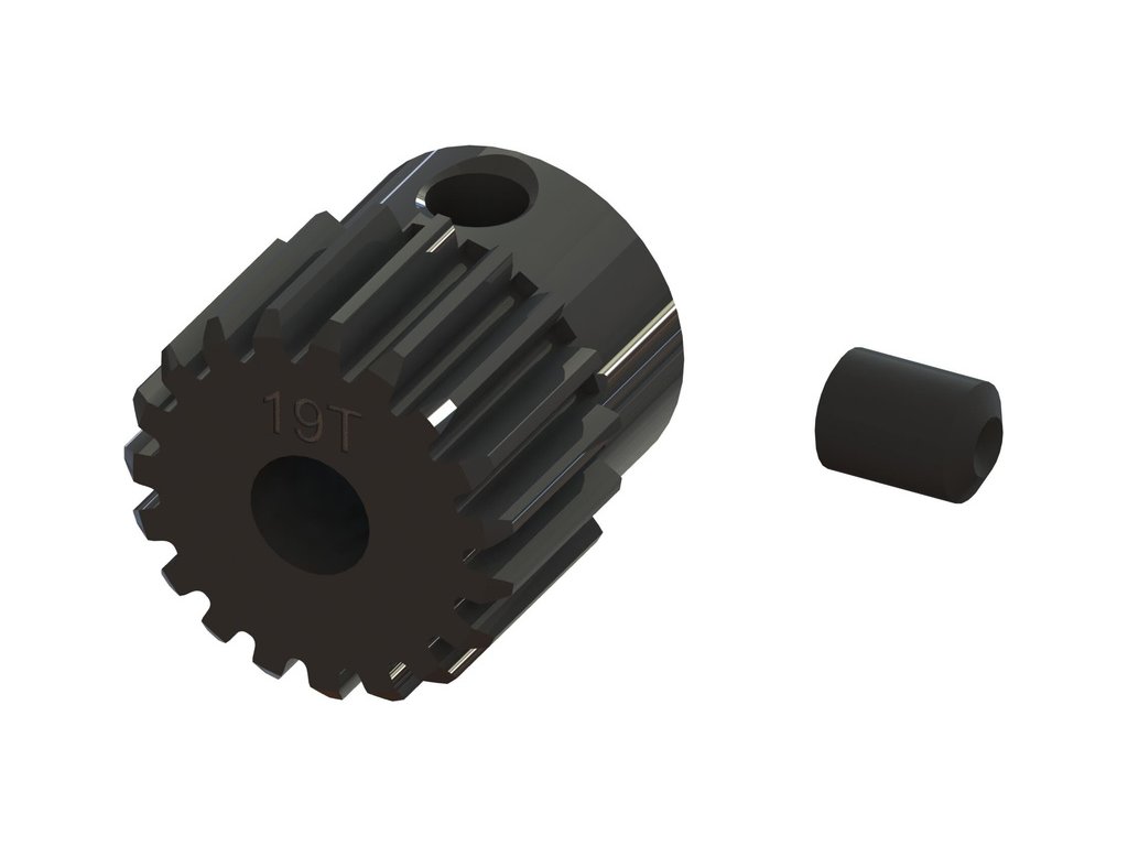 Arrma pastorek na hřídel 3.2 mm s 19 zuby a modulem ozubení 50.8DP (0,5 mm) pro RC modely aut. Vyrobeno z kalené oceli. CNC obráběný. Stavěcí šroub M3 x 4 mm.