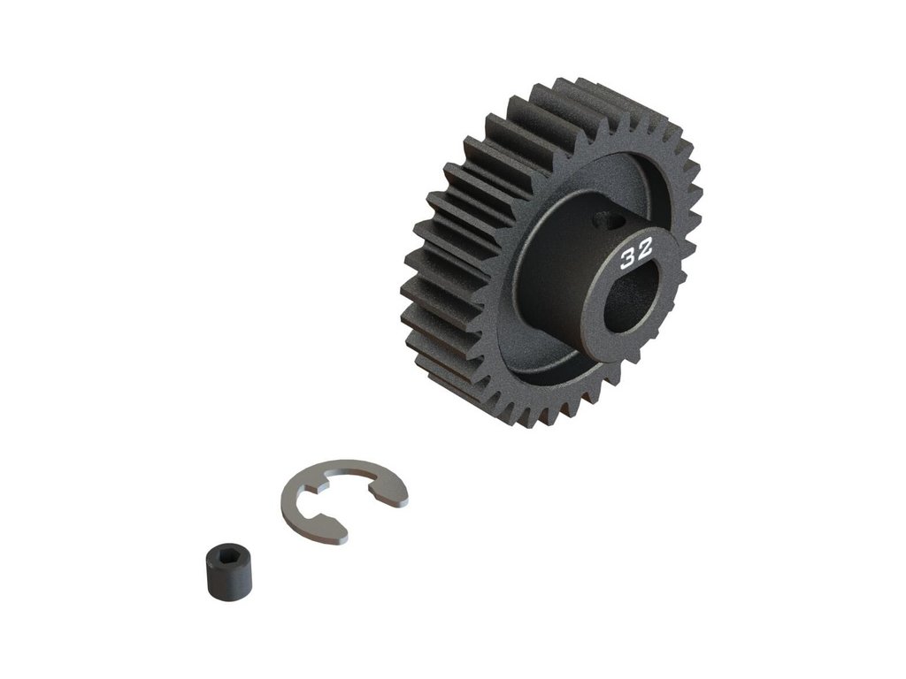 Arrma ocelový pastorek 32 zubů, modul M1, otvor Safe-D8. Otvor ve tvaru 'D' odpovídá profilu hřídele motoru s hřídelí 8mm a drážkou, proto se nemůže pastorek na hřídeli protočit. Stavěcí šroub - M4 x 4mm, segrovka 6mm. Precizně vyrobený široký profil zubu pro hladký chod.