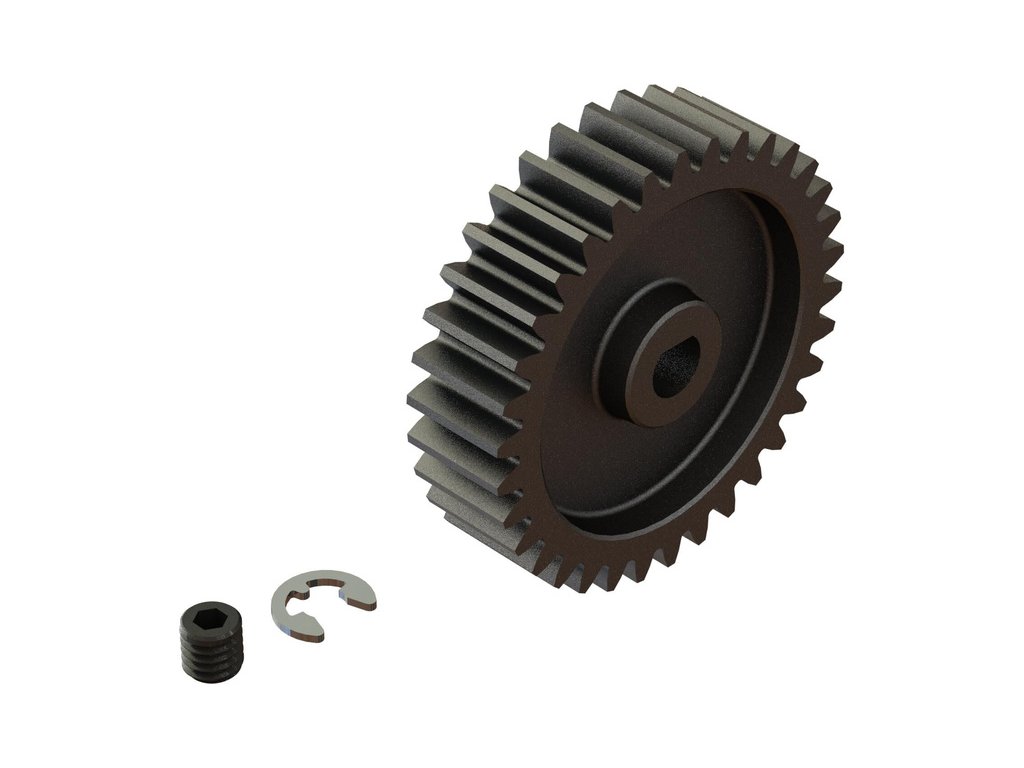 Arrma ocelový pastorek 34 zubů, modul M1, otvor Safe-D5. Otvor ve tvaru 'D' odpovídá profilu hřídele motoru s hřídelí 5mm a drážkou, proto se nemůže pastorek na hřídeli protočit. Stavěcí šroub - M4 x 4mm, segrovka 3,2mm. Precizně vyrobený široký profil zubu pro hladký chod.