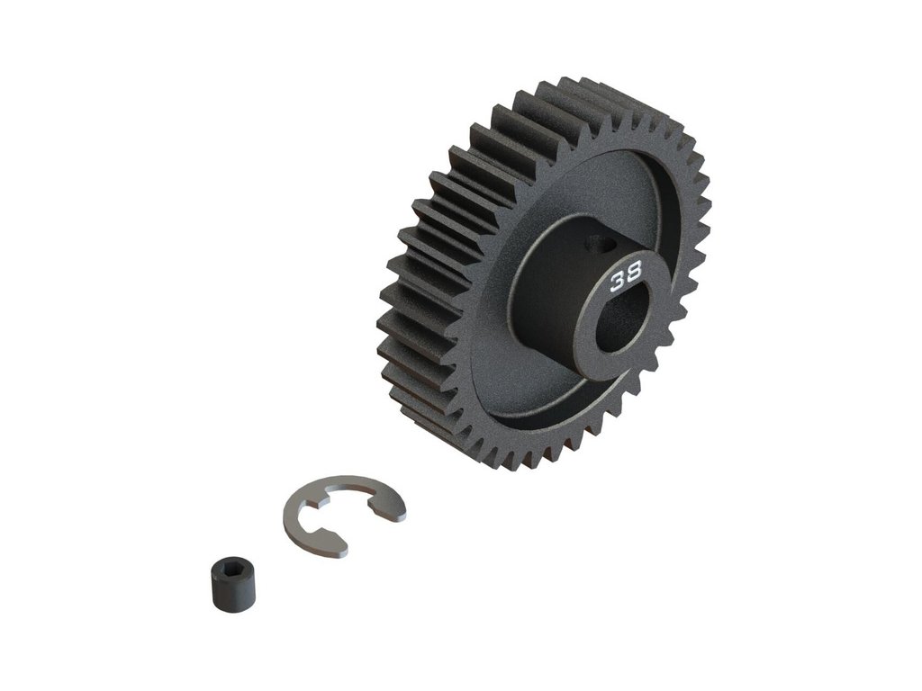 Arrma ocelový pastorek 38 zubů, modul M1, otvor Safe-D8. Otvor ve tvaru 'D' odpovídá profilu hřídele motoru s hřídelí 8mm a drážkou, proto se nemůže pastorek na hřídeli protočit. Stavěcí šroub - M4 x 4mm, segrovka 6mm. Precizně vyrobený široký profil zubu pro hladký chod.