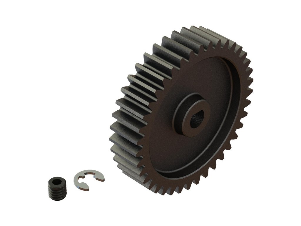 Arrma ocelový pastorek 39 zubů, modul M1, otvor Safe-D5. Otvor ve tvaru 'D' odpovídá profilu hřídele motoru s hřídelí 5mm a drážkou, proto se nemůže pastorek na hřídeli protočit. Stavěcí šroub - M4 x 4mm, segrovka 3,2mm. Precizně vyrobený široký profil zubu pro hladký chod.