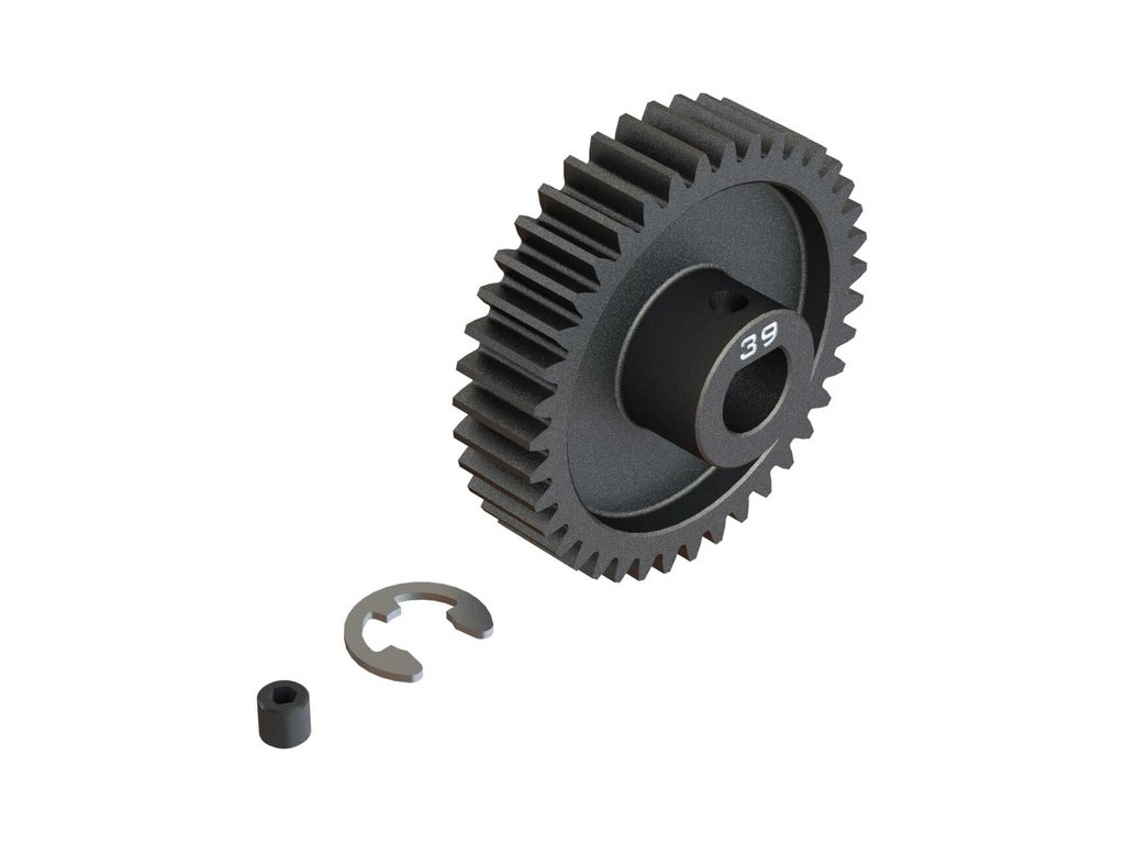 Arrma ocelový pastorek 39 zubů, modul M1, otvor Safe-D8. Otvor ve tvaru 'D' odpovídá profilu hřídele motoru s hřídelí 8mm a drážkou, proto se nemůže pastorek na hřídeli protočit. Stavěcí šroub - M4 x 4mm, segrovka 6mm. Precizně vyrobený široký profil zubu pro hladký chod.