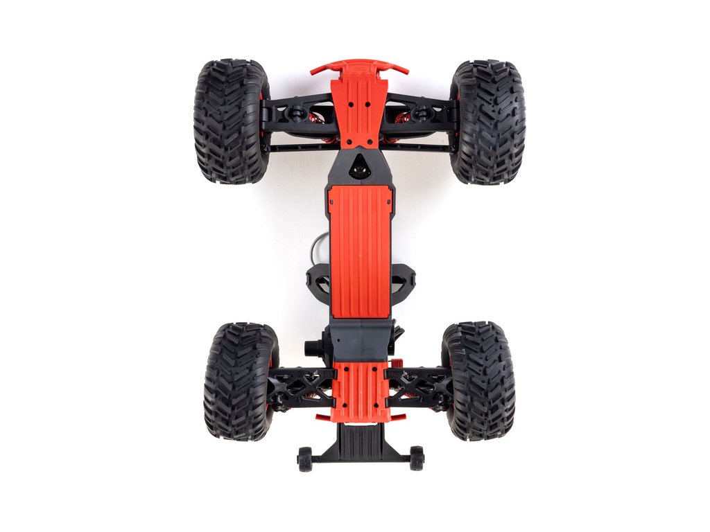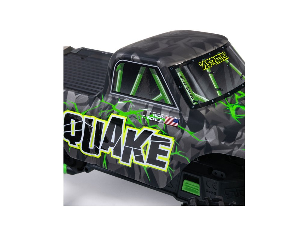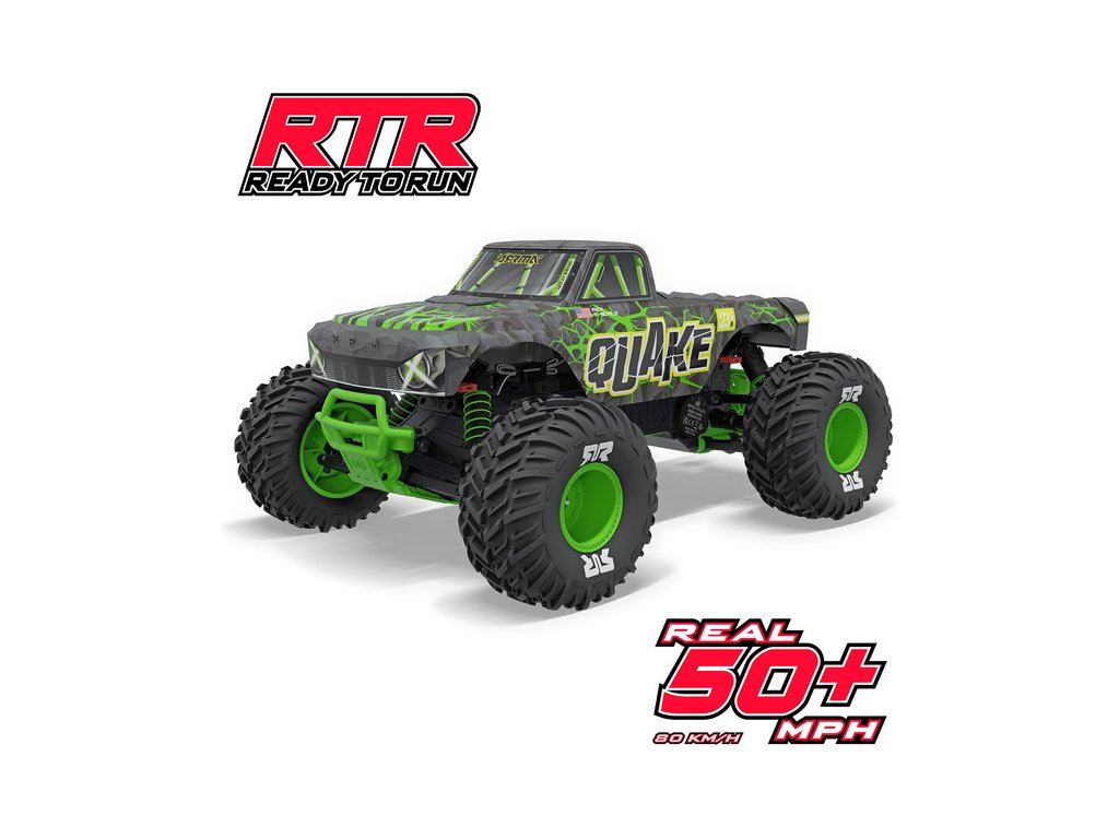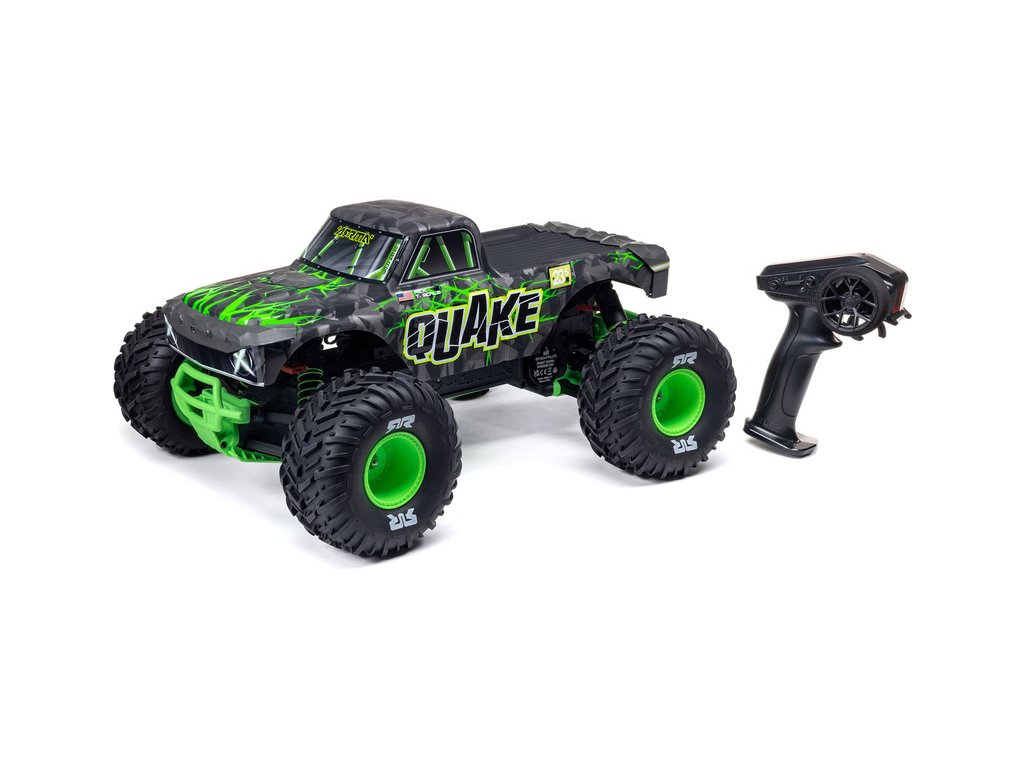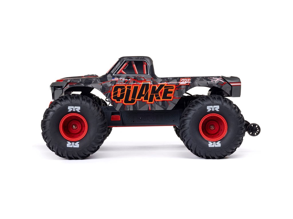 Arrma Quake má klasickou konstrukci oblíbených modelů typu monster truck s vysokou světlou výškou a velkými koly, což mu umožňuje uhánět téměř v jakémkoli prostředí – v terénu, na trávě, na parkovištích i asfaltovém povrchu. Nepřekonatelný bude zejména při jízdě v náročném terénu a při přejíždění i velkých nerovností. Kompozitní šasi odolá i tvrdým nárazům. Použité kovové převody jsou dostatečně odolné pro střídavý pohon. Maximální trakci zajišťují osvědčené pneumatiky dBoots Cut Chevron MT s typickým šípovým vzorem dezénu. Vysílač Spektrum SLT poskytuje bezpečný provoz bez výpadků, pro bezstarostnou jízdu jsou na modelu použity voděodolné* komponenty - regulátor s přijímače Spektrum 2-v-1 45A a servo řízení Spektrum S681 s vysokým točivým momentem.