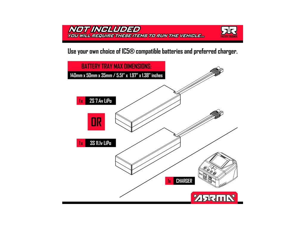 Model lze provozovat na 2 až 3 článkový LiPo akumulátor. Akumulátor by měl být osazen konektorem EC5 nebo IC5. Pro běžné ježdění doporučujeme 2 článkový LiPo akumulátor (7.4 V).