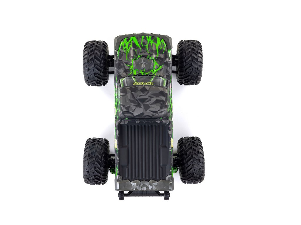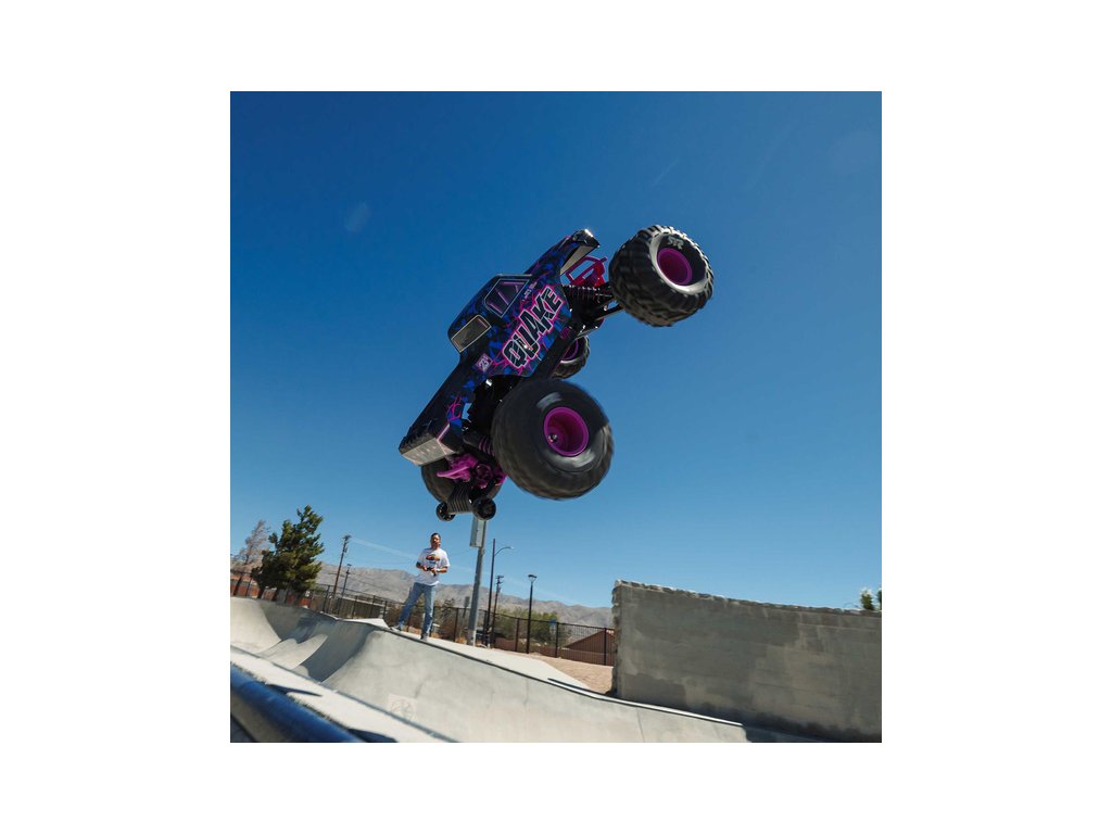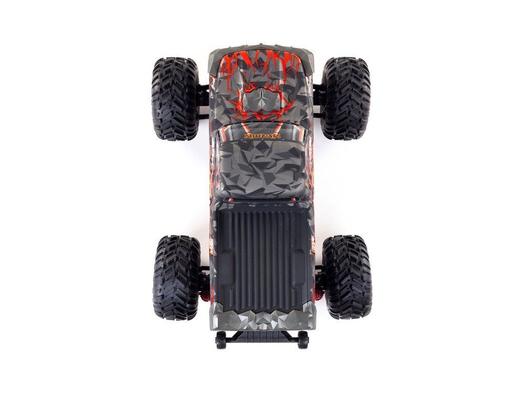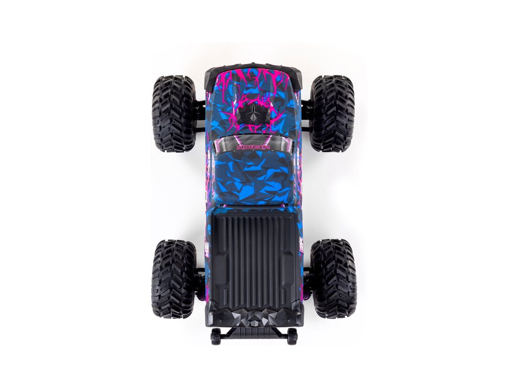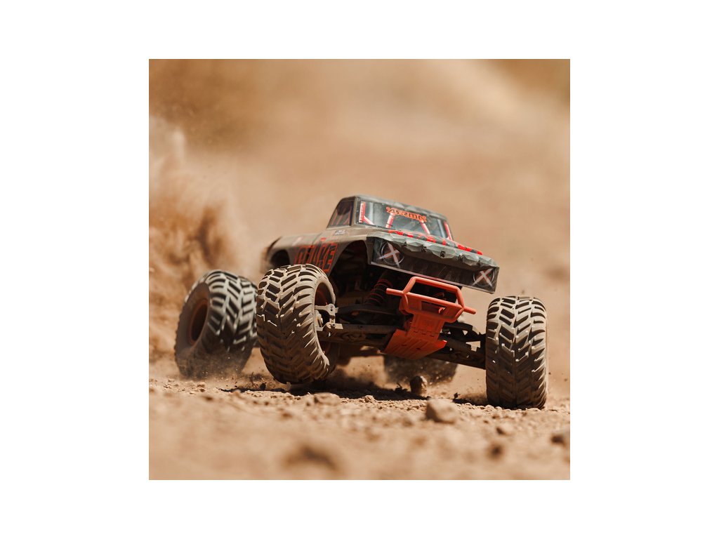 RC model monster trucku Arrma Quake 223S BLX s výkonným střídavým motorem a rychlostí až 80 km/h. Náhon 2WD, nezávislé zavěšení, olejové tlumiče, řídící jednotka Spektrum 45A SLT, napájení 2-3S LiPo, elektronická stabilizace DSC.