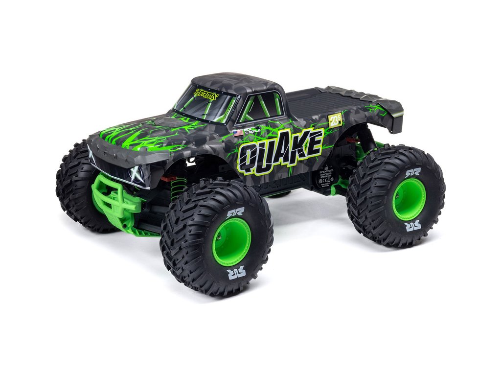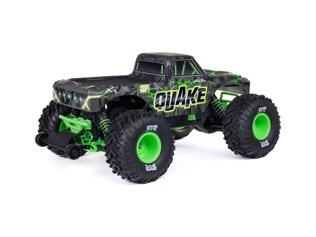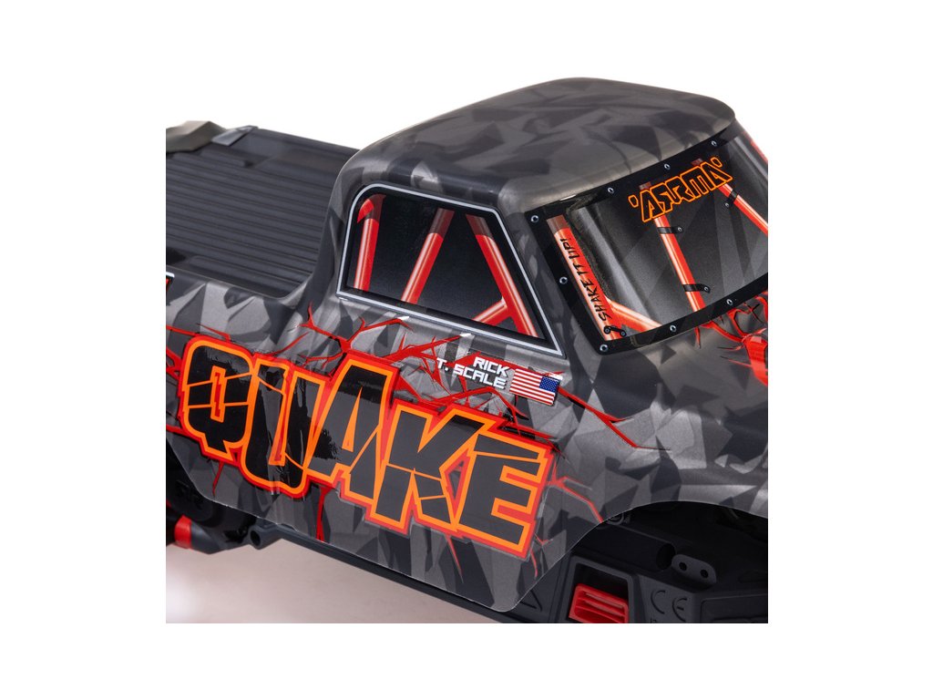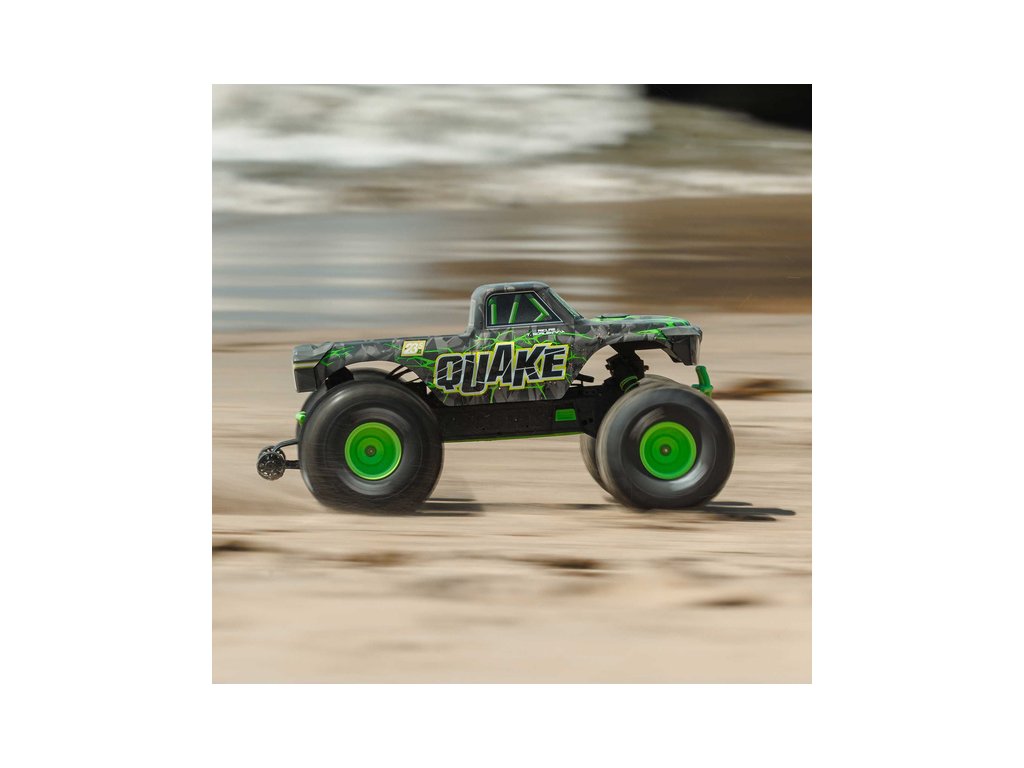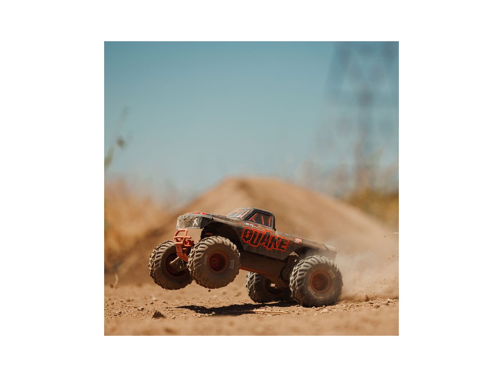 Arrma Quake má klasickou konstrukci oblíbených modelů typu monster truck s vysokou světlou výškou a velkými koly, což mu umožňuje uhánět téměř v jakémkoli prostředí – v terénu, na trávě, na parkovištích i asfaltovém povrchu. Nepřekonatelný bude zejména při jízdě v náročném terénu a při přejíždění i velkých nerovností. Kompozitní šasi odolá i tvrdým nárazům. Použité kovové převody jsou dostatečně odolné pro střídavý pohon. Maximální trakci zajišťují osvědčené pneumatiky dBoots Cut Chevron MT s typickým šípovým vzorem dezénu. Vysílač Spektrum SLT poskytuje bezpečný provoz bez výpadků, pro bezstarostnou jízdu jsou na modelu použity voděodolné* komponenty - regulátor s přijímače Spektrum 2-v-1 45A a servo řízení Spektrum S681 s vysokým točivým momentem.