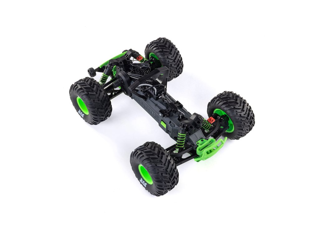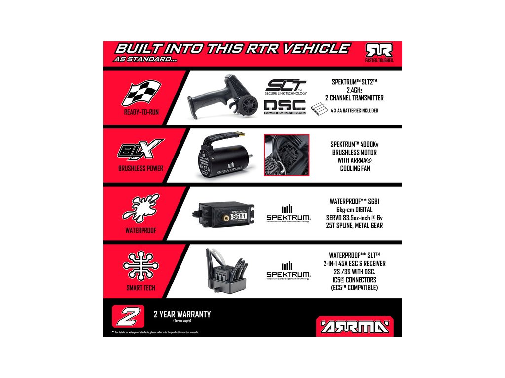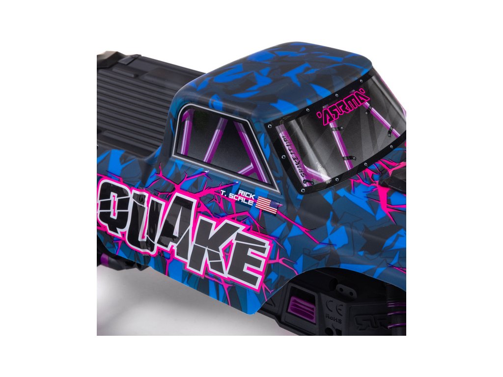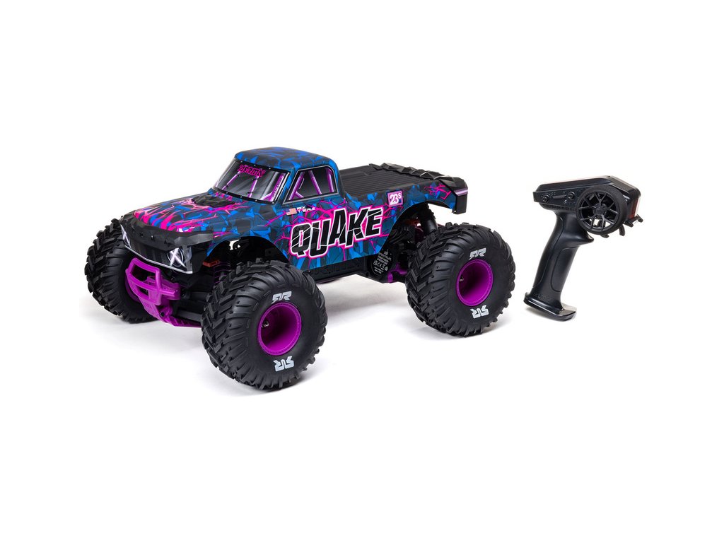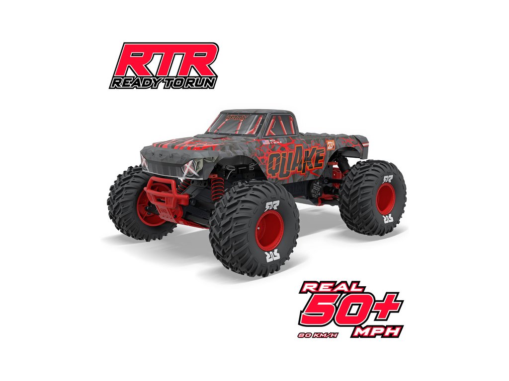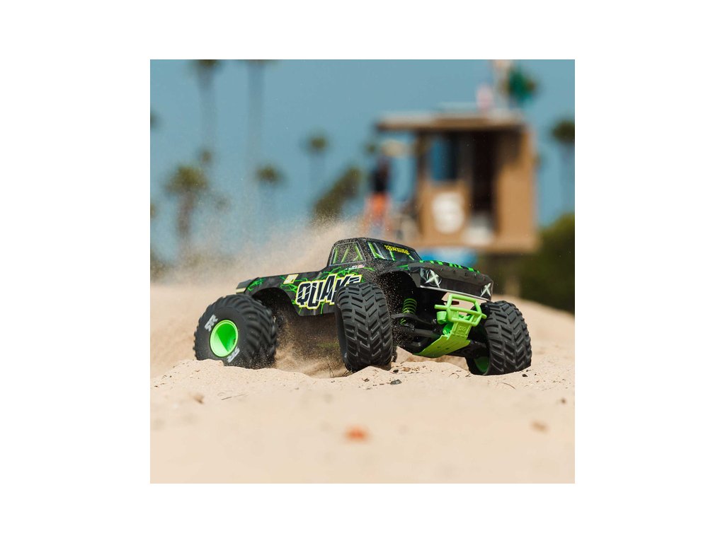 Arrma Quake má klasickou konstrukci oblíbených modelů typu monster truck s vysokou světlou výškou a velkými koly, což mu umožňuje uhánět téměř v jakémkoli prostředí – v terénu, na trávě, na parkovištích i asfaltovém povrchu. Nepřekonatelný bude zejména při jízdě v náročném terénu a při přejíždění i velkých nerovností. Kompozitní šasi odolá i tvrdým nárazům. Použité kovové převody jsou dostatečně odolné pro střídavý pohon. Maximální trakci zajišťují osvědčené pneumatiky dBoots Cut Chevron MT s typickým šípovým vzorem dezénu. Vysílač Spektrum SLT poskytuje bezpečný provoz bez výpadků, pro bezstarostnou jízdu jsou na modelu použity voděodolné* komponenty - regulátor s přijímače Spektrum 2-v-1 45A a servo řízení Spektrum S681 s vysokým točivým momentem.