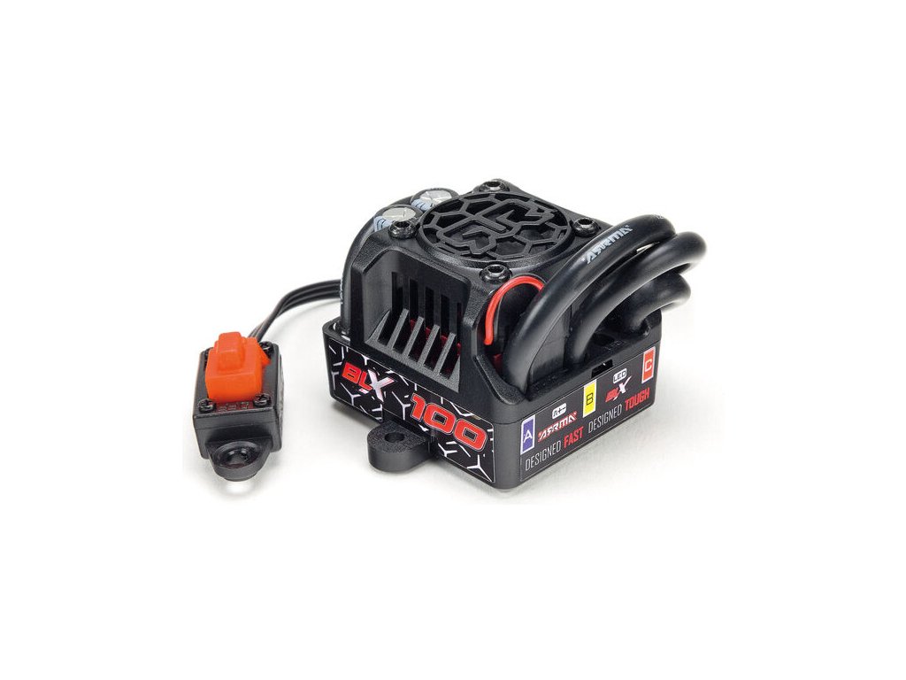 Střídavý regulátor Arrma BLX100. Proudové zatížení až 100A. Podpora 3S Lipo akumulátorů. 3 Jízdní režimy, ochrana proti podvybití akumulátoru a přepěťová ochrana. Aktivní chladič. Vypínač s programovým tlačítkem. Konektor IC5.