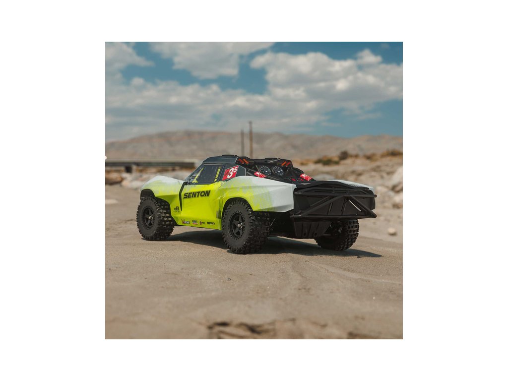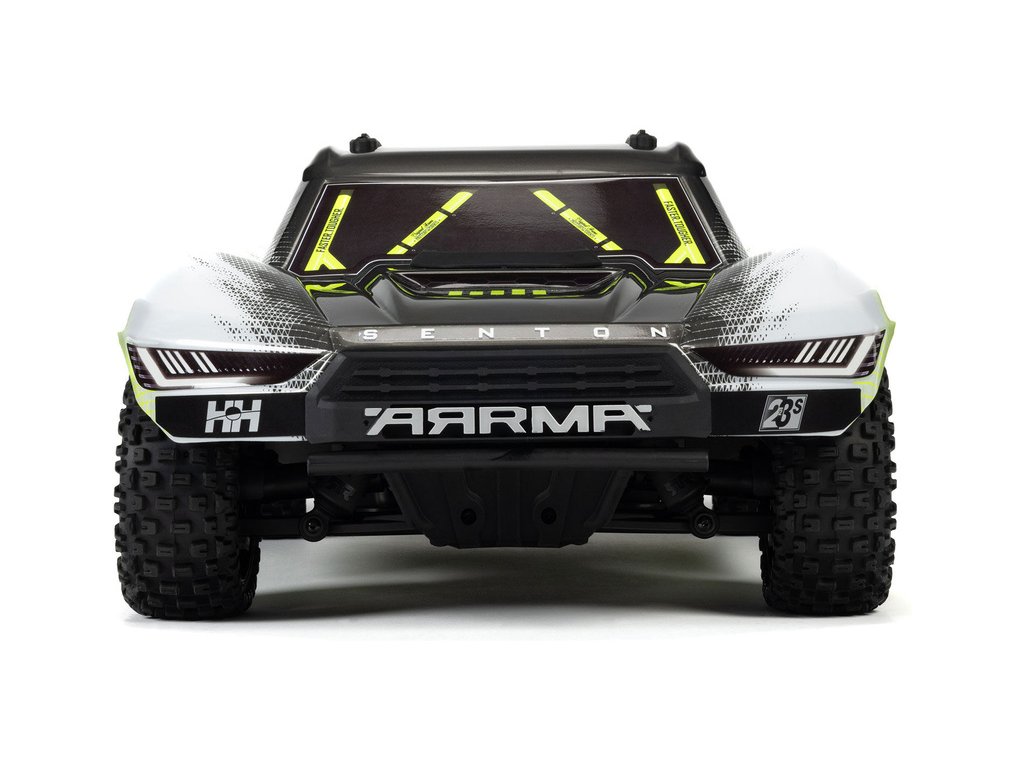 RC model auta Arrma Senton překvapí svou houževnatostí a odolností. Má pevný kompozitní podvozek s bočními Nerf výztuhami a zvýšené bočnice proti vnikání nečistot. Nízký podvozek umožňuje projíždět zatáčky vysokou rychlostí. Model je vhodný pro tvrdé povrchy, šotolinu a nízkou trávu. Použité kovové převody jsou dostatečně odolné pro střídavý pohon. Výkon je distribuován na jednotlivá kola pomocí přední a zadního diferenciálu. Maximální trakci zajišťují osvědčené pneumatiky dBoots Fortress SC. Vysílač Spektrum SLT poskytuje bezpečný provoz bez výpadků, pro bezstarostnou jízdu jsou na modelu použity voděodolné* komponenty - regulátor s přijímače Spektrum 2-v-1 85A a servo řízení Spektrum S662 s vysokým točivým momentem a kovovými převody.