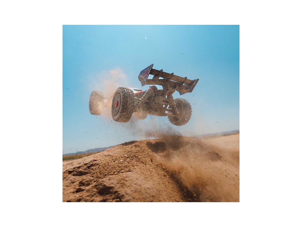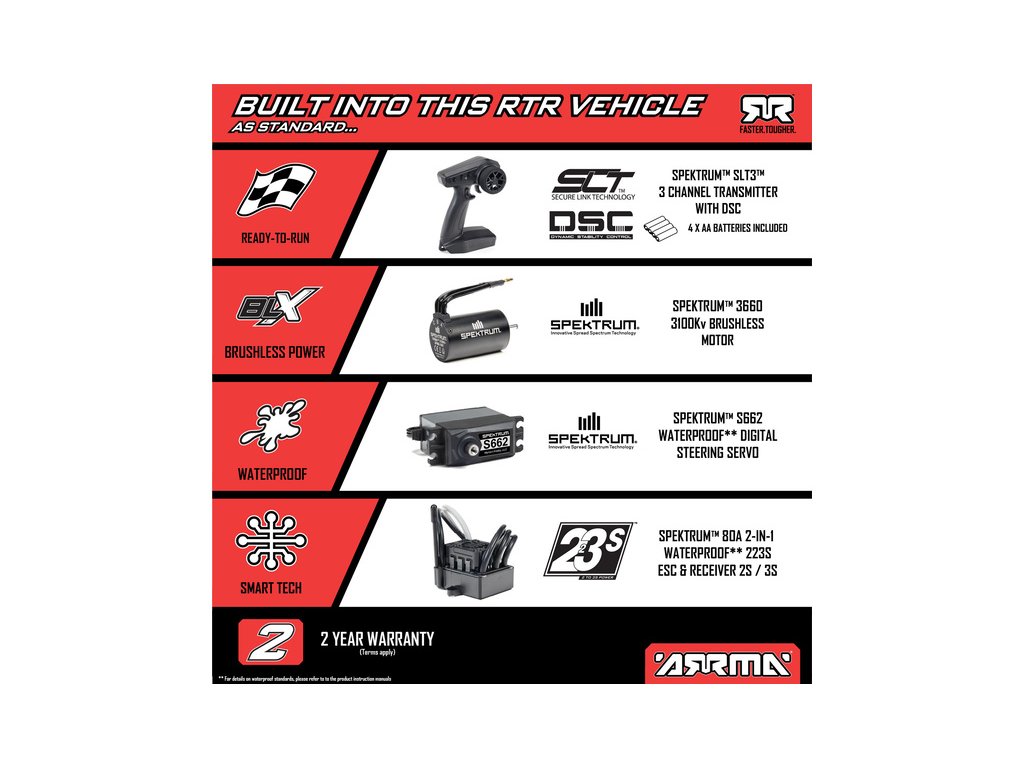 Osvědčená odolná platforma ARRMA® 4X4, vám umožní jezdit vysokou rychlostí téměř v jakémkoli prostředí - v terénu, na šotolině a trávě, na parkovištích i po zpevněných a asfaltových površích. Odolnost šasí vychází ze silného kompozitového podvozku, s prodlouženou výškou chráničů nečistot. Použité kovové převody jsou dostatečně odolné pro střídavý pohon. Výkon je distribuován na jednotlivá kola pomocí přední a zadního diferenciálu. Maximální trakci zajišťují osvědčené úzké pneumatiky dBoots. Přítlak ve vyšší rychlostech zvyšuje zadní křídlo. Vysílač Spektrum SLT poskytuje bezpečný provoz bez výpadků, pro bezstarostnou jízdu jsou na modelu použity voděodolné* komponenty - regulátor s přijímače Spektrum 2-v-1 85A a servo řízení Spektrum S662 s vysokým točivým momentem a kovovými převody.
