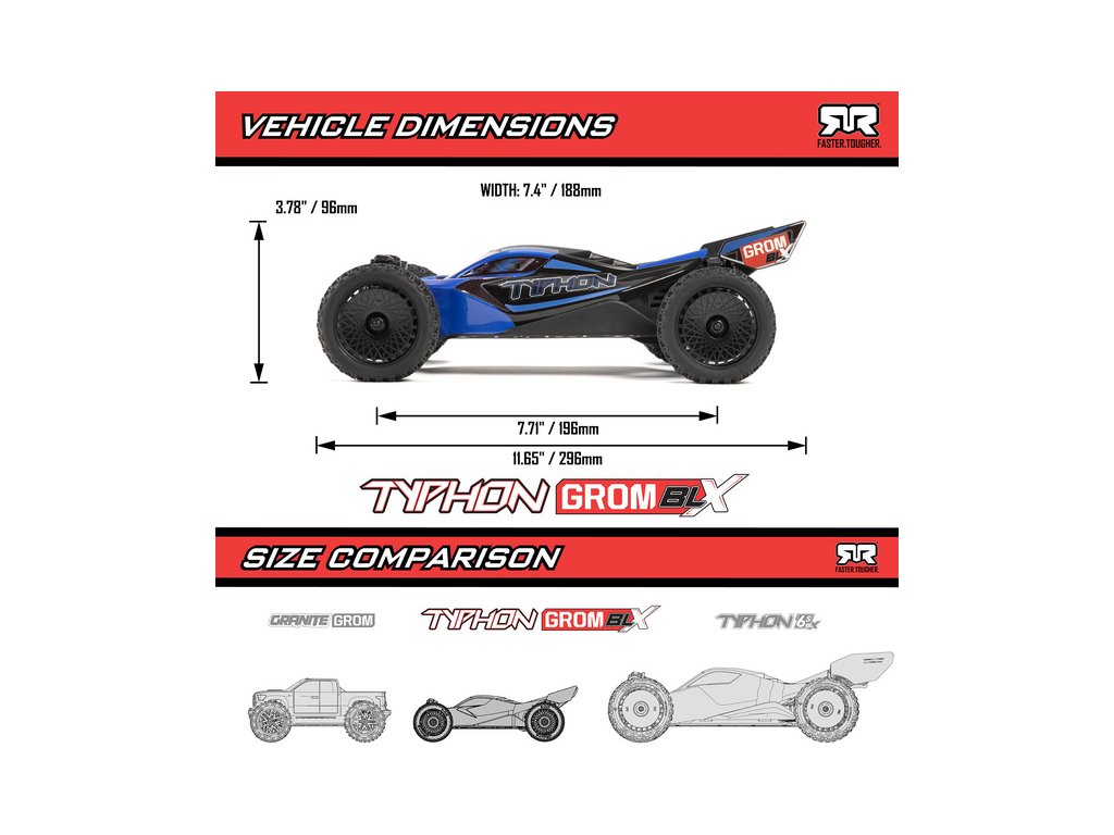 ARRMA TYPHON GROM 4X4 1:14 RTR je navržen a vyroben podle stejně vysokých standardů, odolnosti a výkonů, jaké očekáváte od RC aut ARRMA. Je jen o něco menší!