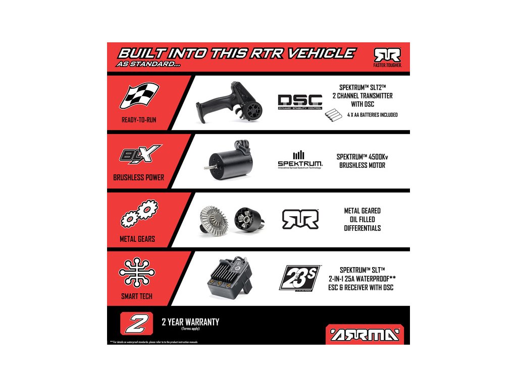 Auto je pro náročnou jízdu skvěle připraveno, obsahuje silné kompozitní šasi s nezávislým zavěšením, olejovými tlumiči a náhonem 4WD. Robustní kovové převody diferenciálů přenáší výkon ze střídavého motoru přes uzavřené hnací ústrojí až na kola a pneumatiky dBoots 2-HO. Dokonce i servo řízení Spektrum™ SX110 má kovové převody a stejně jako řídící jednotka 2-v-1 25A, vybavená konektorem IC2®, je voděodolné* pro jízdu v mokrém prostředí. Integrovaný vysokorychlostní chladicí ventilátor udržuje nízké teploty motoru a regulátoru pro dlouhou životnost a špičkový výkon.