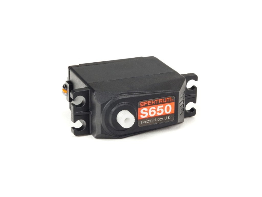 Kvalitní servo standardní velikosti Spektrum S650 má plastové převody, moment 6 kg.cm, rychlost 0.12 s/60° při napájení 6 V. Vložené O-kroužky dodávají servu odolnost proti stříkající vodě. Výstupní tisícihran serva má 23 zubů.