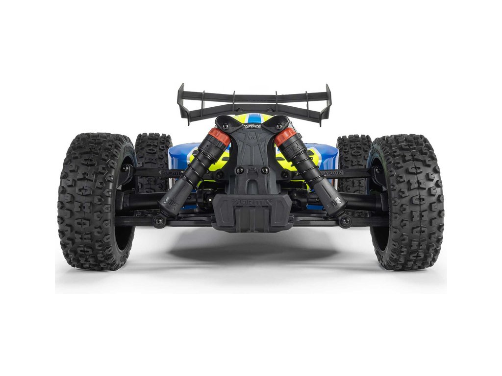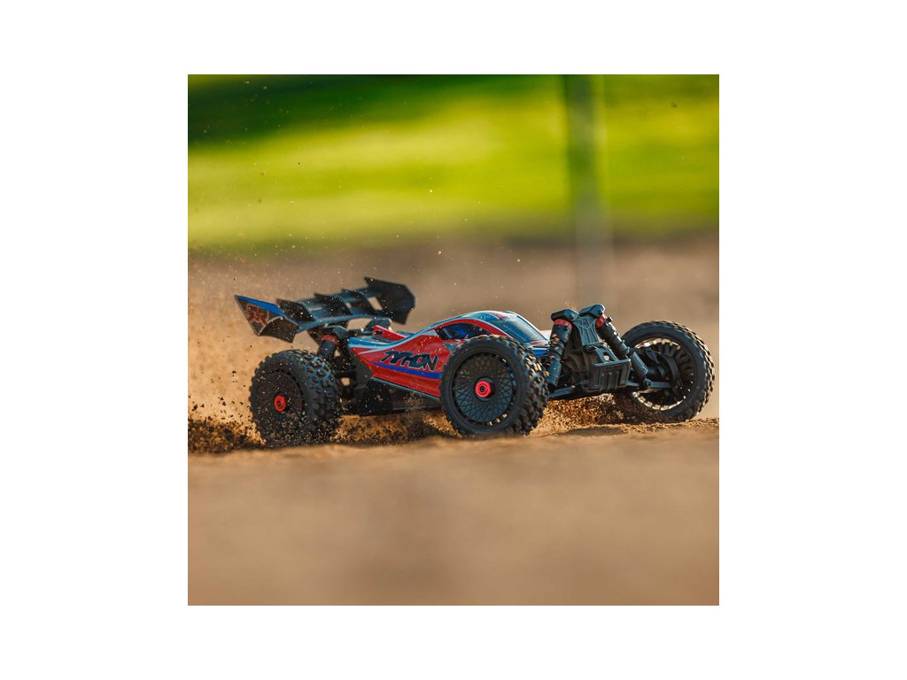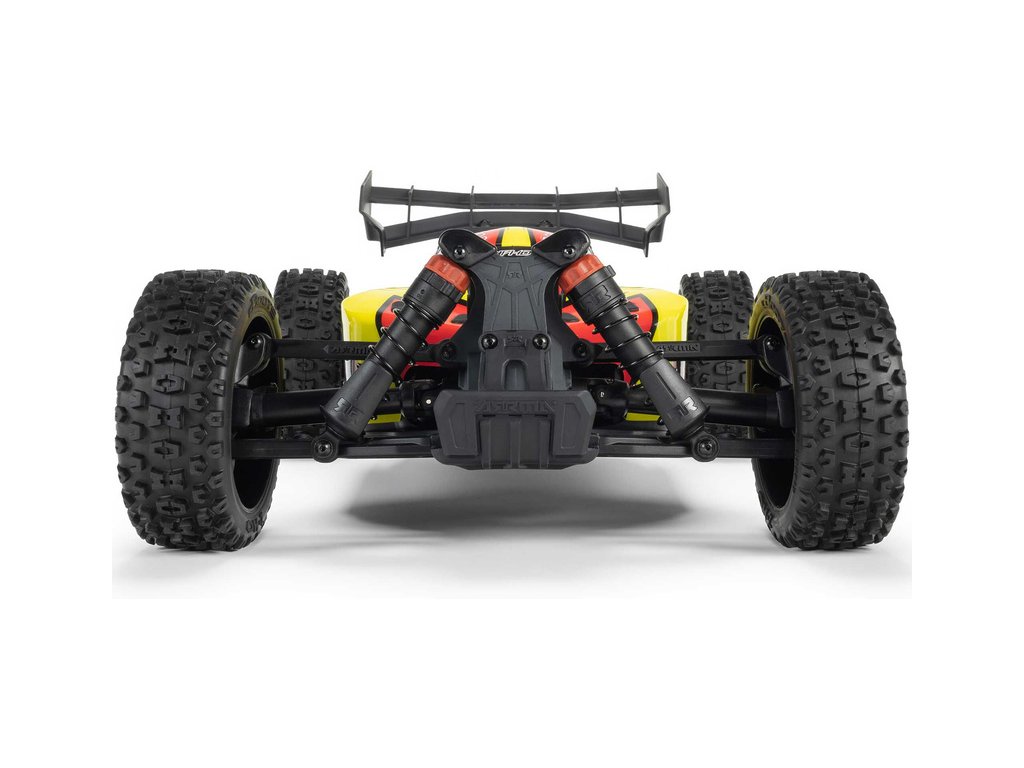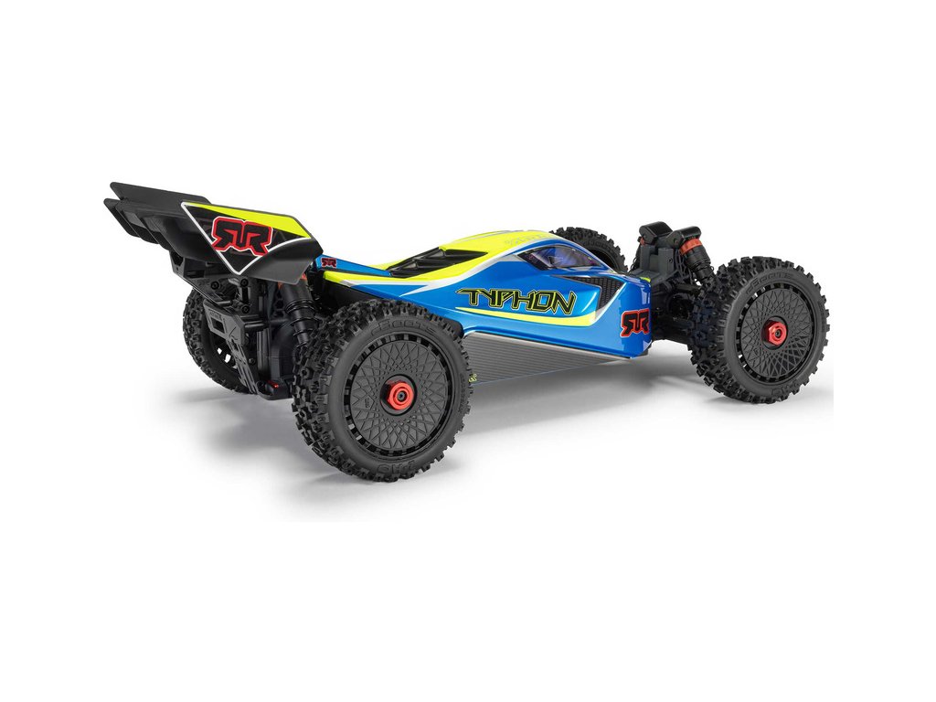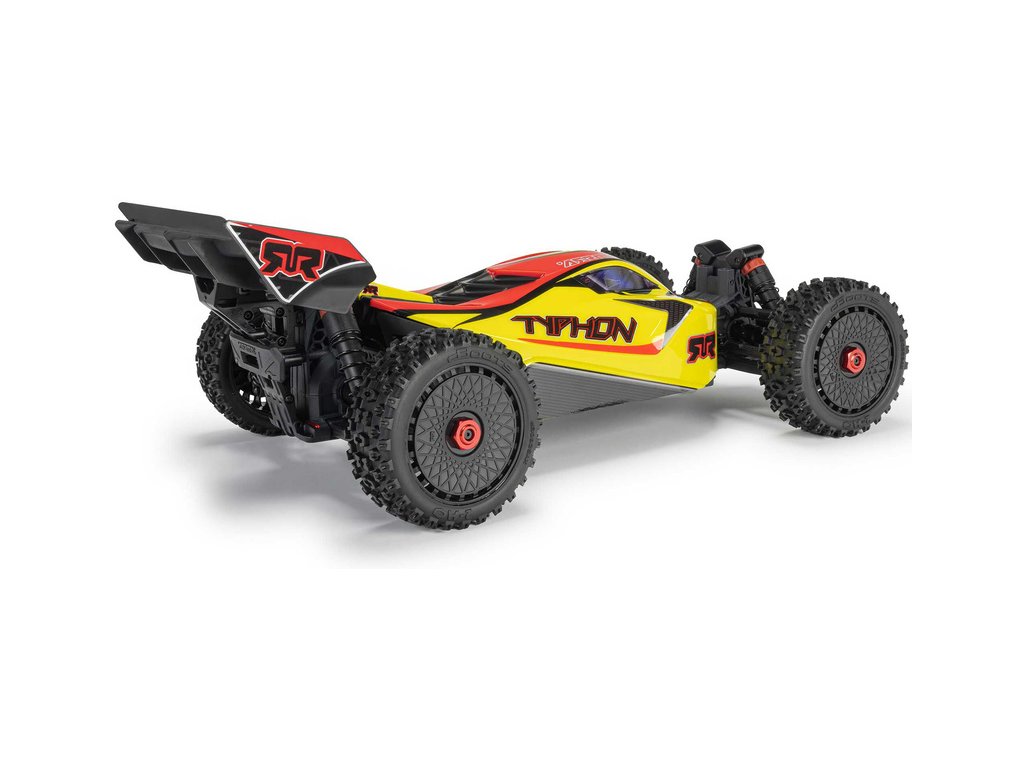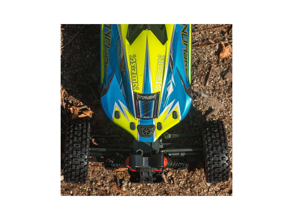 RC model buggy Arrma Typhon Mega v měřítku 1:8 s pohonem 4x4 a rychlostí až 32 km/h. Odolné šasi s kluznými deskami a zvýšenými bočnicemi. Robustní diferenciály s kovovými převody. Nadrozměrný o 11% větší stejnosměrný motor 665. Olejové tlumiče. RC souprava Spektrum SLT2.