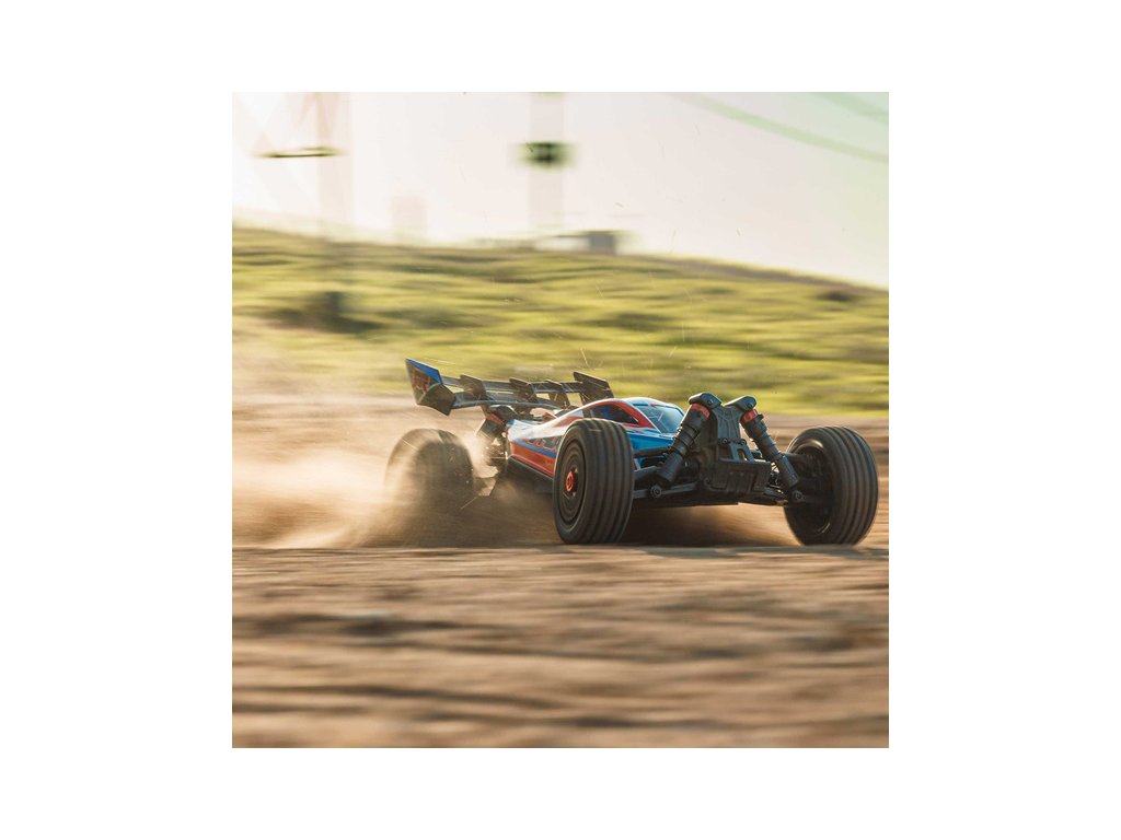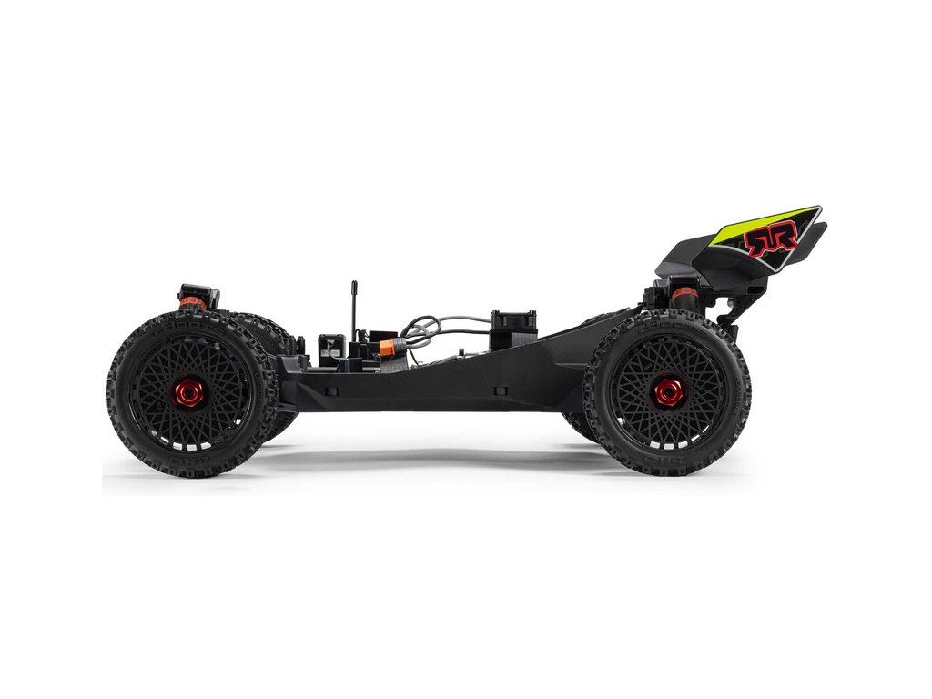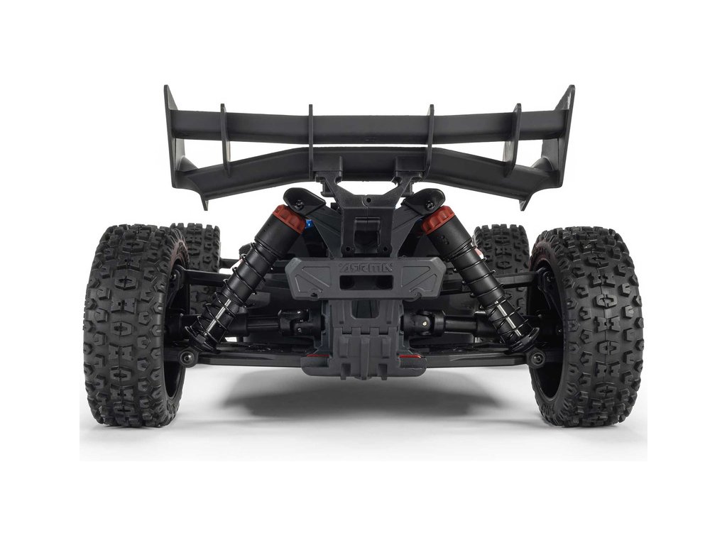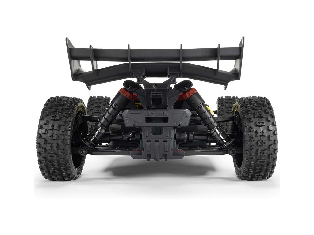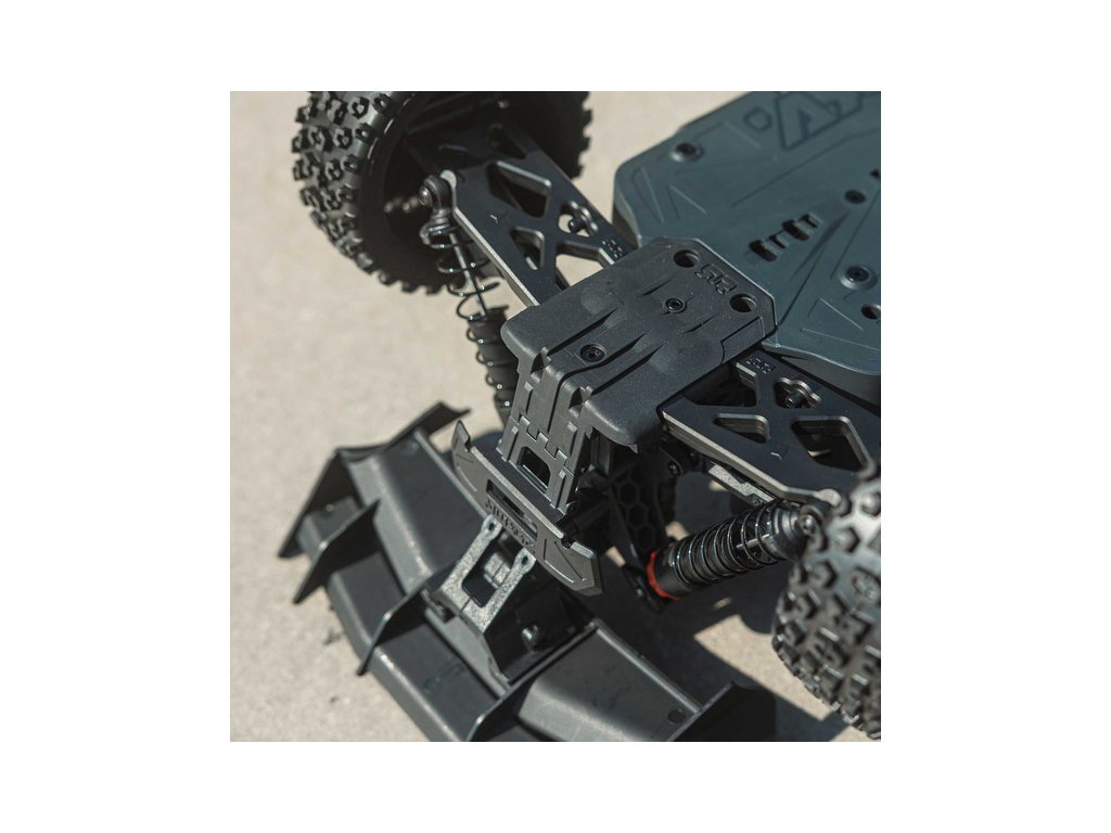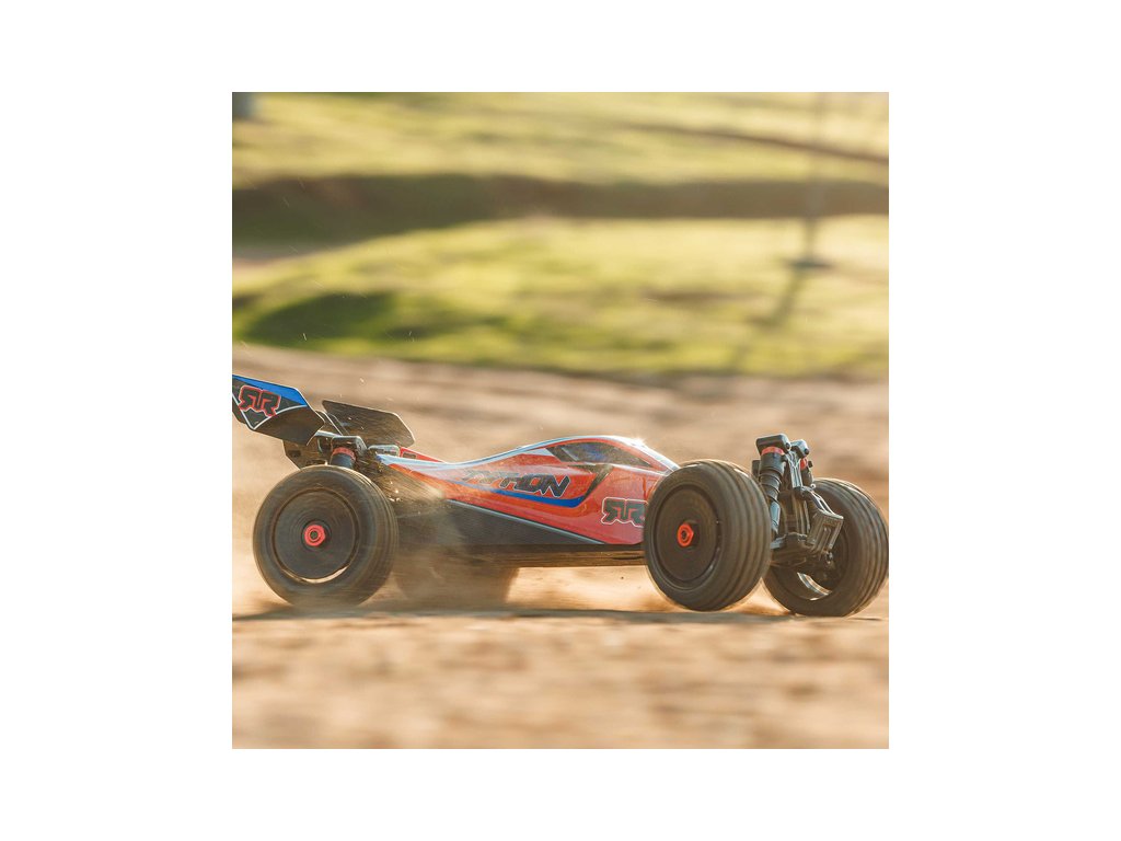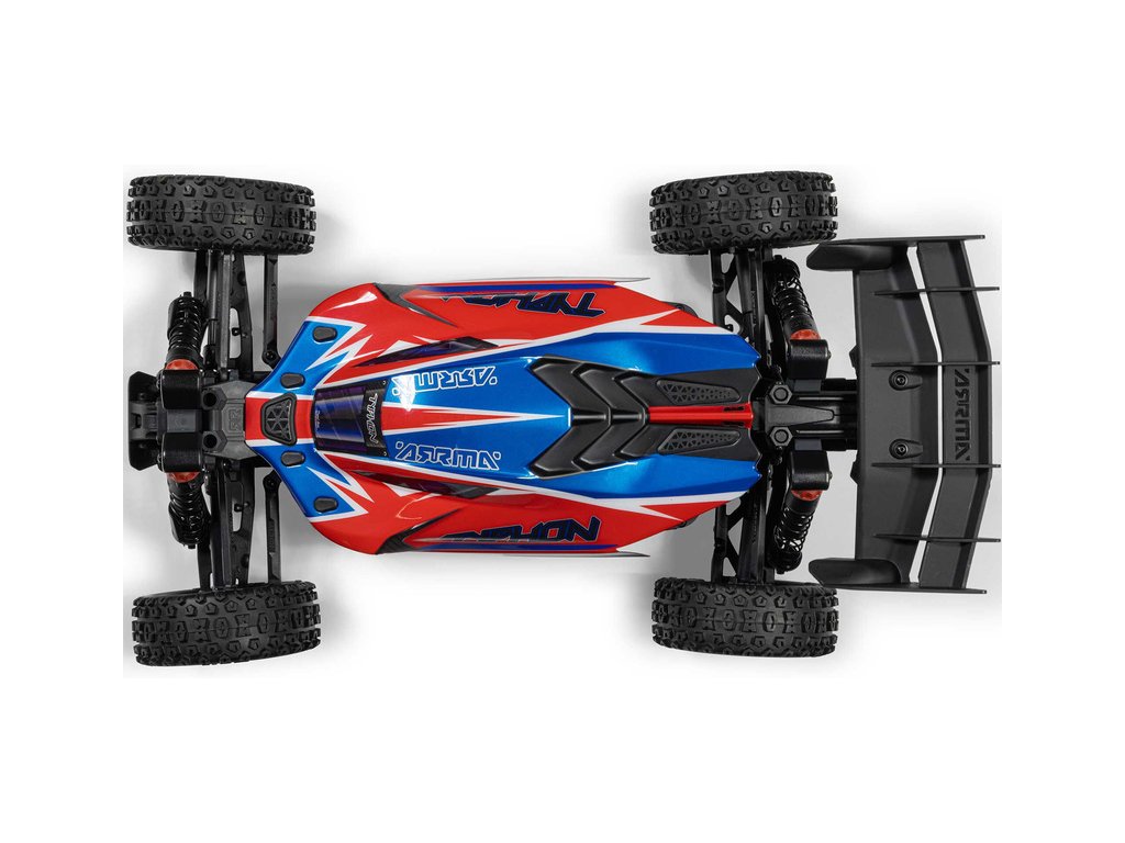 RC model buggy Arrma Typhon Mega v měřítku 1:8 s pohonem 4x4 a rychlostí až 32 km/h. Odolné šasi s kluznými deskami a zvýšenými bočnicemi. Robustní diferenciály s kovovými převody. Nadrozměrný o 11% větší stejnosměrný motor 665. Olejové tlumiče. RC souprava Spektrum SLT2.