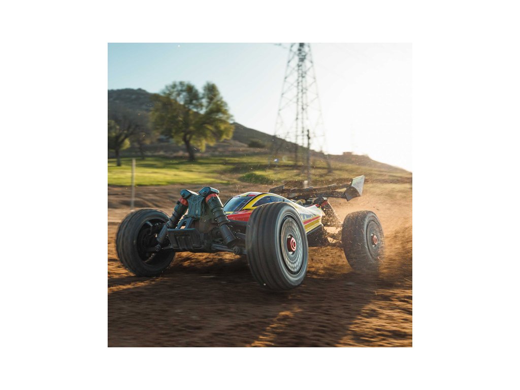RC model buggy Arrma Typhon Mega v měřítku 1:8 s pohonem 4x4 a rychlostí až 32 km/h. Odolné šasi s kluznými deskami a zvýšenými bočnicemi. Robustní diferenciály s kovovými převody. Nadrozměrný o 11% větší stejnosměrný motor 665. Olejové tlumiče. RC souprava Spektrum SLT2.