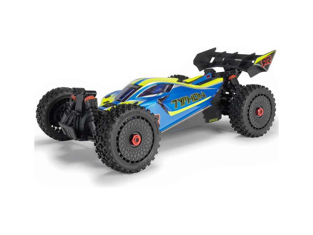 RC model buggy Arrma Typhon Mega v měřítku 1:8 s pohonem 4x4, ideální pro děti a začátečníky, který nabízí extra výkon ihned po vybalení, díky o 11% většímu stejnosměrnému motoru 665 (High Speed). Dosahuje rychlosti až 32 km/h. Odolné šasi s kluznými deskami a zvýšenými bočnicemi proti vnikání nečistot. Robustní diferenciály s kovovými převody. Olejové tlumiče. Bezsponková karoserie pro snadnou výměnu akumulátoru. RC souprava Spektrum SLT2.