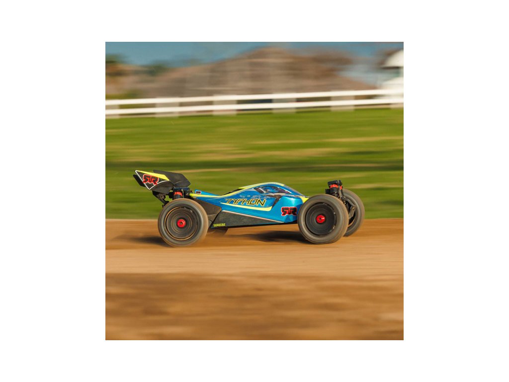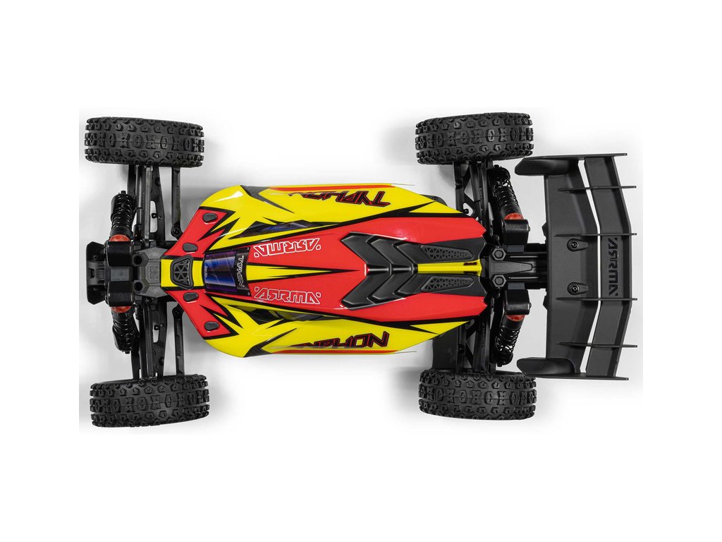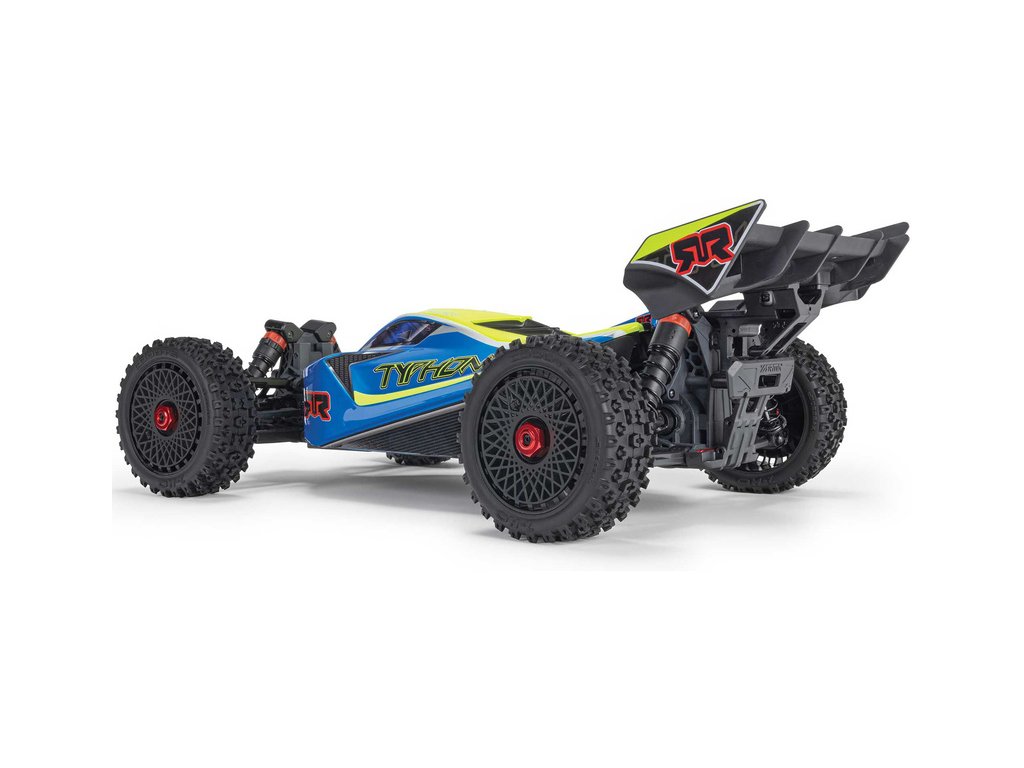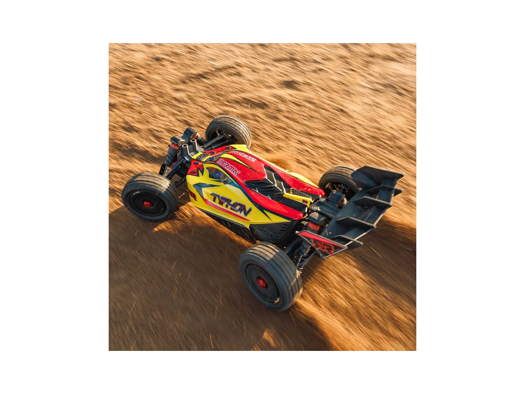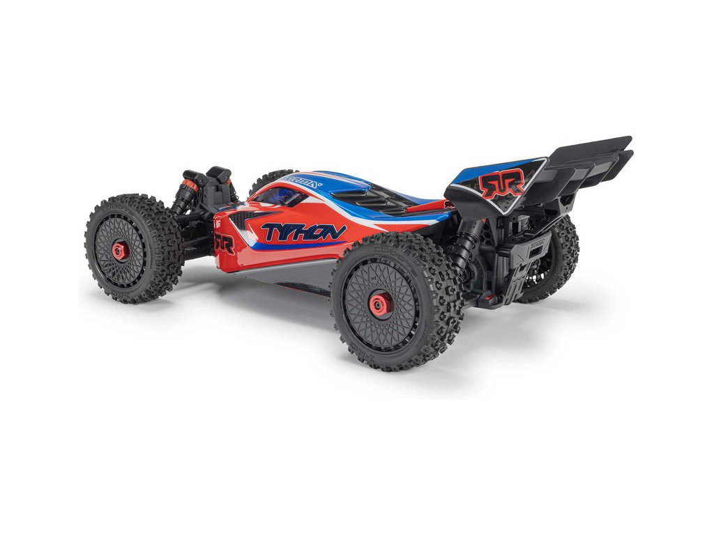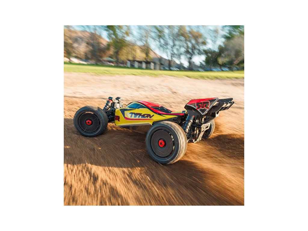RC model buggy Arrma Typhon Mega v měřítku 1:8 s pohonem 4x4 a rychlostí až 32 km/h. Odolné šasi s kluznými deskami a zvýšenými bočnicemi. Robustní diferenciály s kovovými převody. Nadrozměrný o 11% větší stejnosměrný motor 665. Olejové tlumiče. RC souprava Spektrum SLT2.