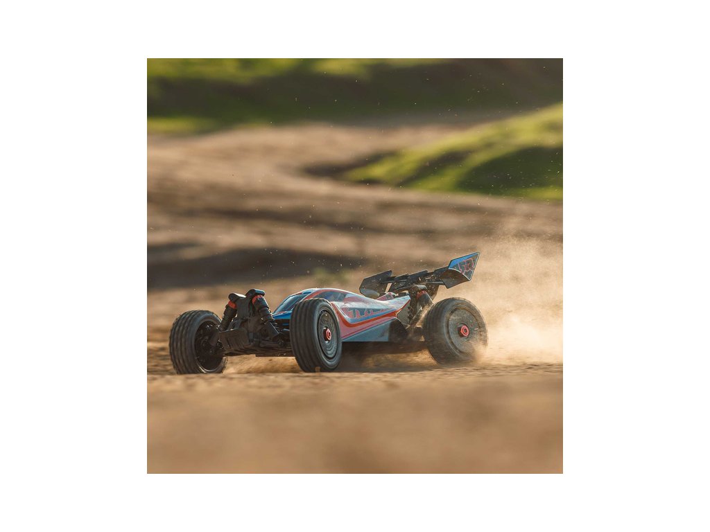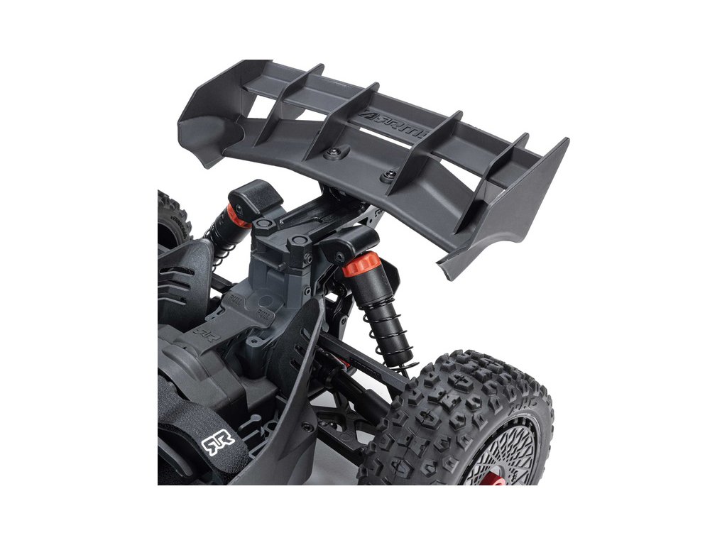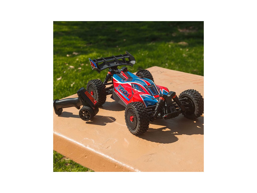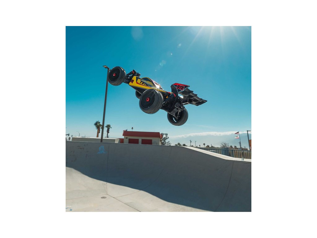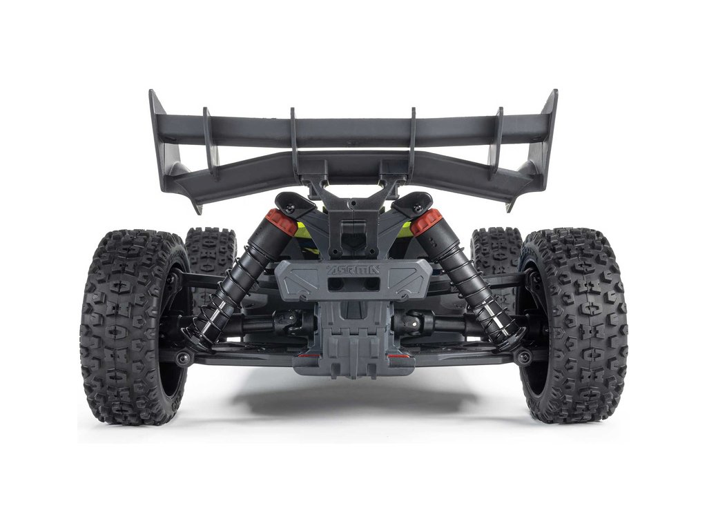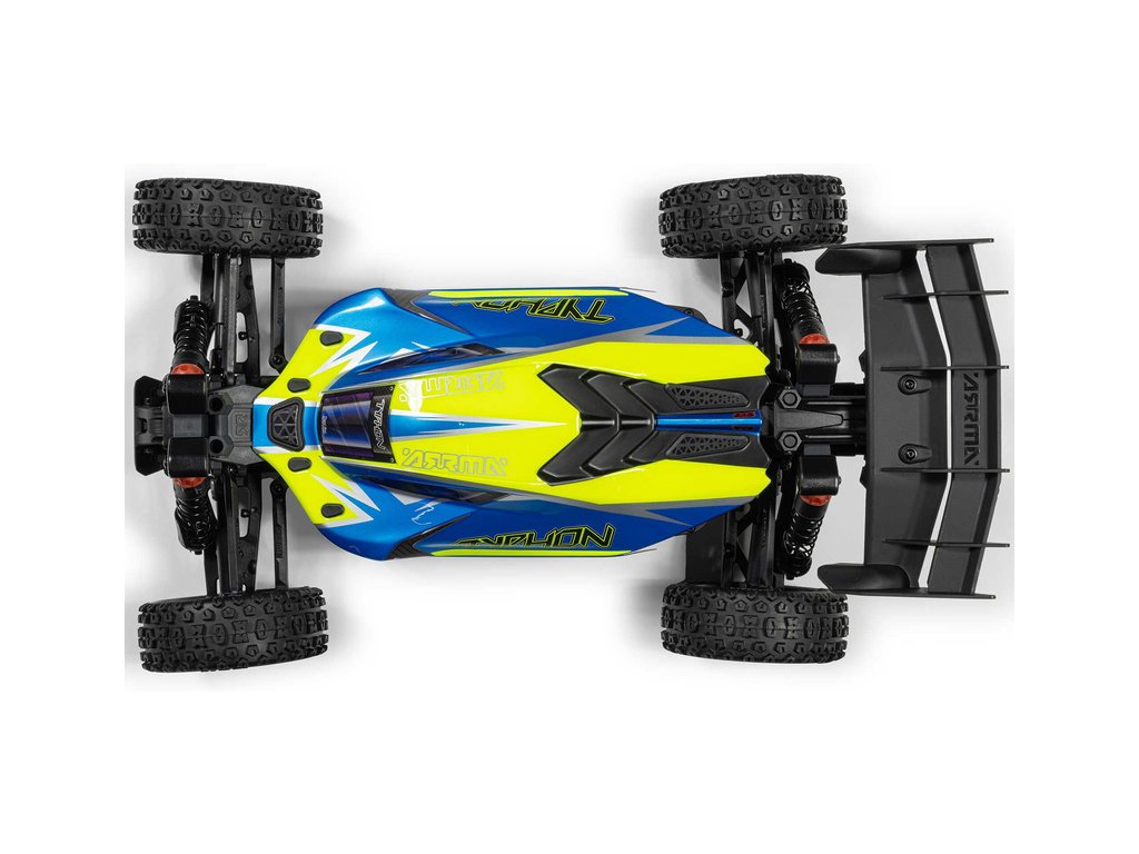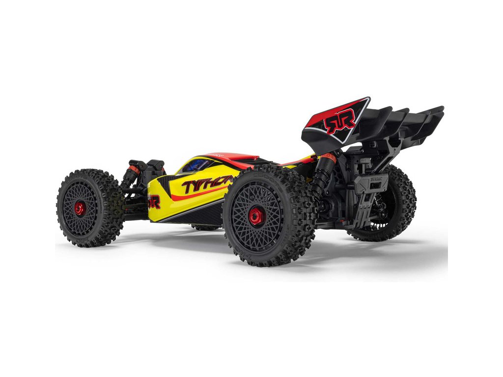 RC model buggy Arrma Typhon Mega v měřítku 1:8 s pohonem 4x4 a rychlostí až 32 km/h. Odolné šasi s kluznými deskami a zvýšenými bočnicemi. Robustní diferenciály s kovovými převody. Nadrozměrný o 11% větší stejnosměrný motor 665. Olejové tlumiče. RC souprava Spektrum SLT2.