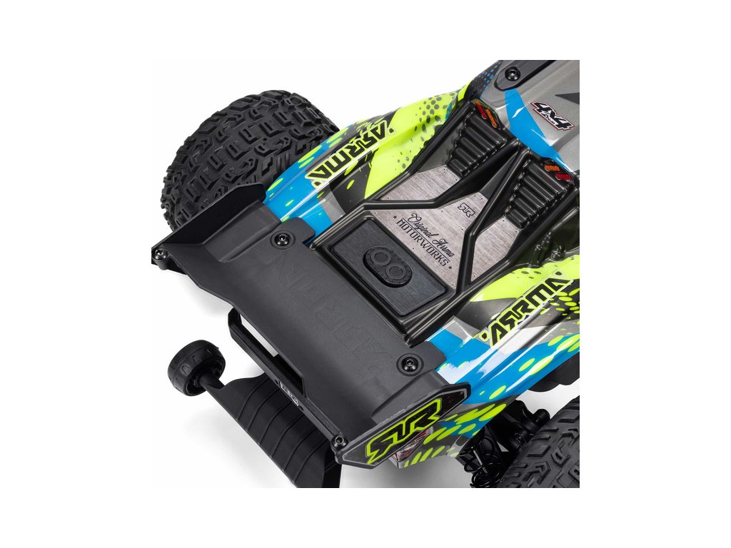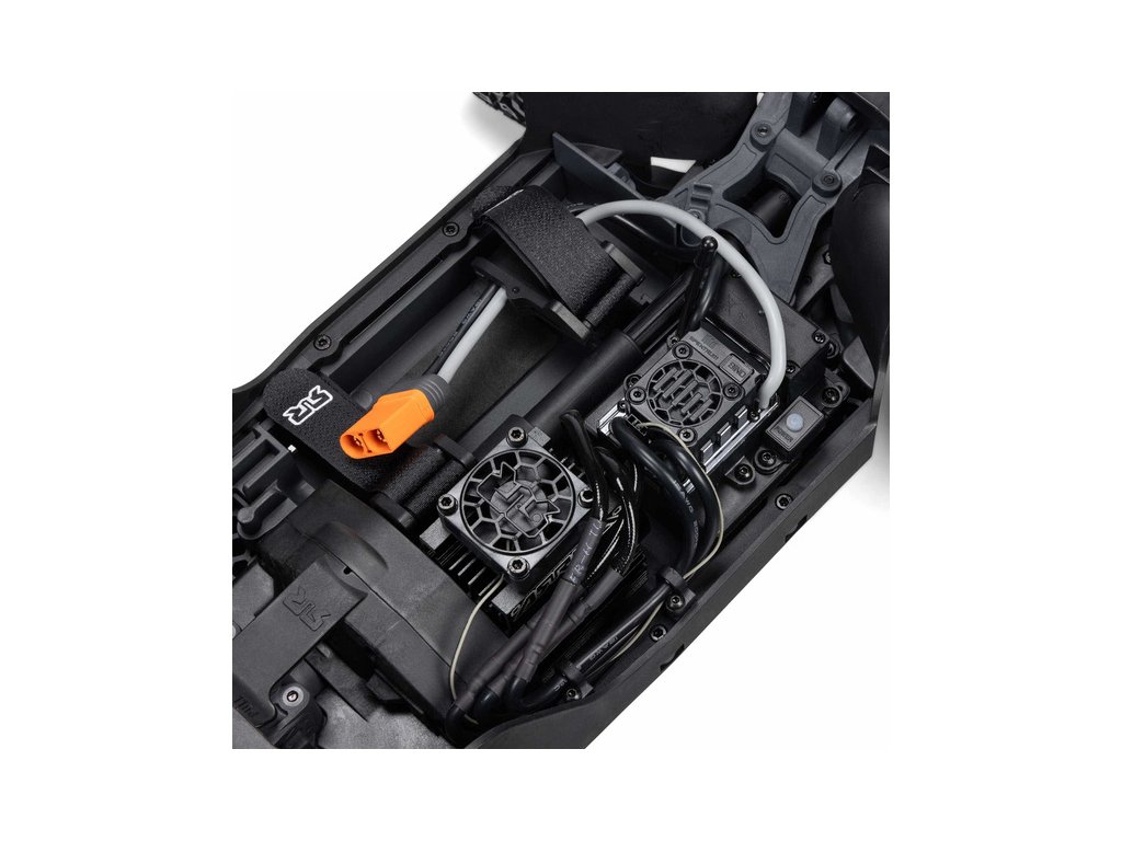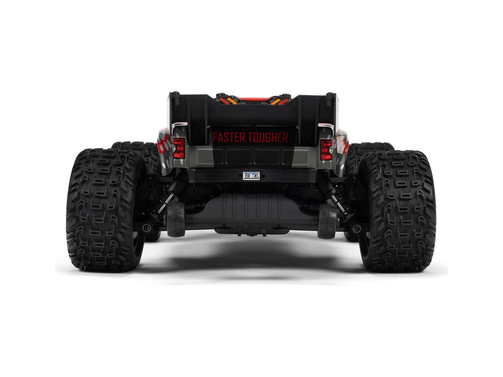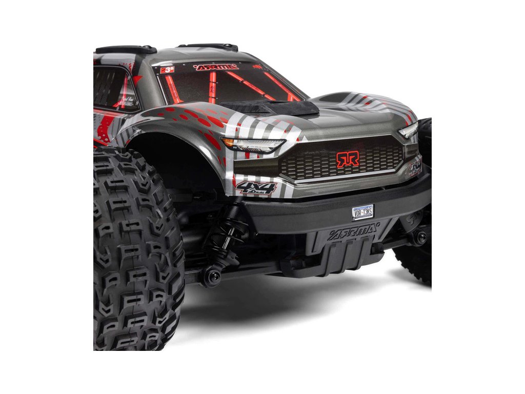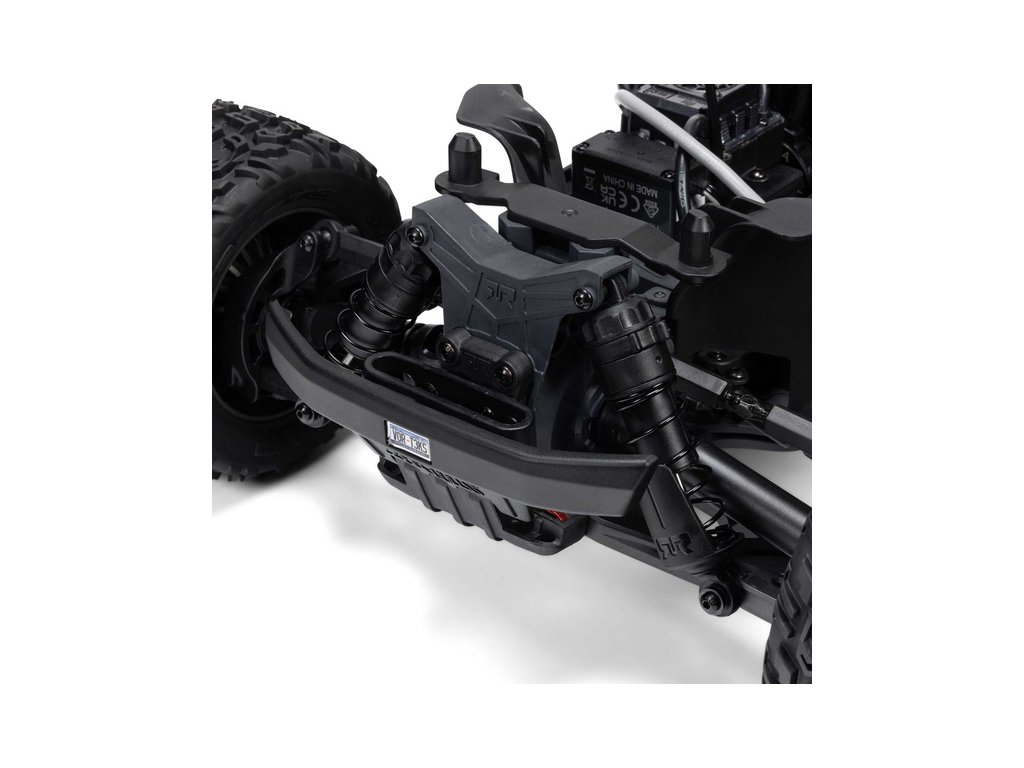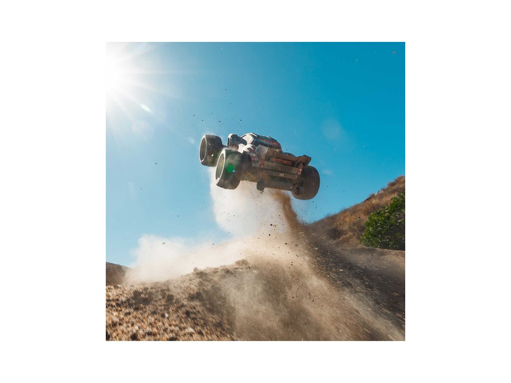 Osvědčená odolná platforma ARRMA® 4X4, vám umožní jezdit vysokou rychlostí téměř v jakémkoli prostředí - v terénu, na šotolině a trávě, na parkovištích i po zpevněných a asfaltových površích. Odolnost šasí vychází ze silného kompozitového podvozku, s prodlouženou výškou chráničů nečistot. Použité kovové převody jsou dostatečně odolné pro střídavý pohon. Výkon je distribuován na jednotlivá kola pomocí přední a zadního diferenciálu. Maximální trakci zajišťují osvědčené pneumatiky dBoots. Vysílač Spektrum SLT poskytuje bezpečný provoz bez výpadků, pro bezstarostnou jízdu jsou na modelu použity voděodolné* komponenty - regulátor s přijímače Spektrum 2-v-1 85A a servo řízení Spektrum S662 s vysokým točivým momentem a kovovými převody.