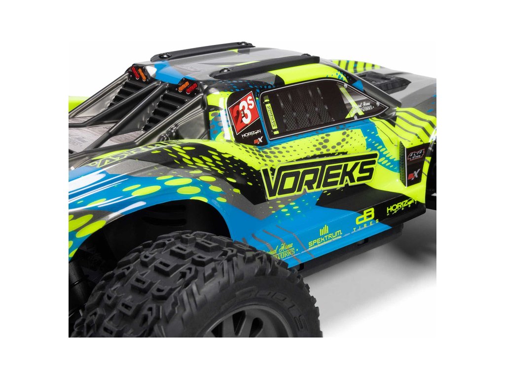 RC model auta Arrma Vorteks 223S BLX v měřítku 1:10, s náhonem 4WD, výkonným střídavým motorem a rychlostí až 80 km/h. Nezávislé zavěšení, olejové tlumiče, řídící jednotka Spektrum 80A SLT 2-3S LiPo, elektronická stabilizace DSC.