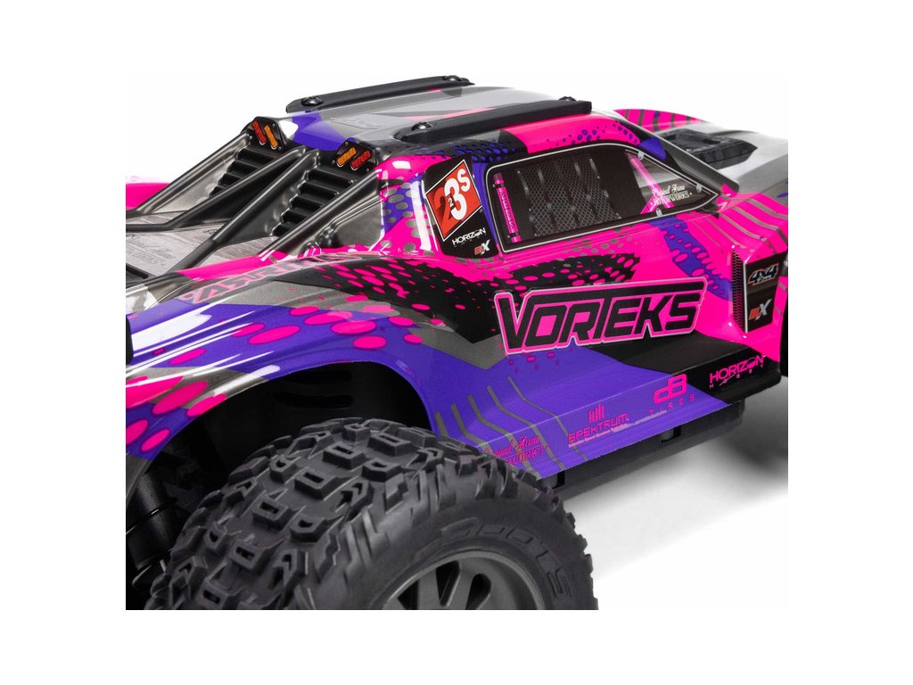 RC model auta Arrma Vorteks 223S BLX typu Truggy s náhonem 4WD, nezávislým zavěšením, olejovými tlumiči a výkonným střídavým pohonem, dosáhne rychlosti až 80 km/h. To vše za dostupnou cenu pro takto výkonný model. Výborné jízdní vlastnosti zajišťuje pohon všech kol se středovým a nápravovými diferenciály. Obsažena je exkluzivní stabilizace jízdy DSC. RC auto je určeno pro děti, dospělé, začátečníky i zkušené jezdce, kteří získají hotový, odolný a rychlý model. To vše je zabaleno do pěkně zpracované karoserie se skrytým bezsponkovým systémem uchycení.