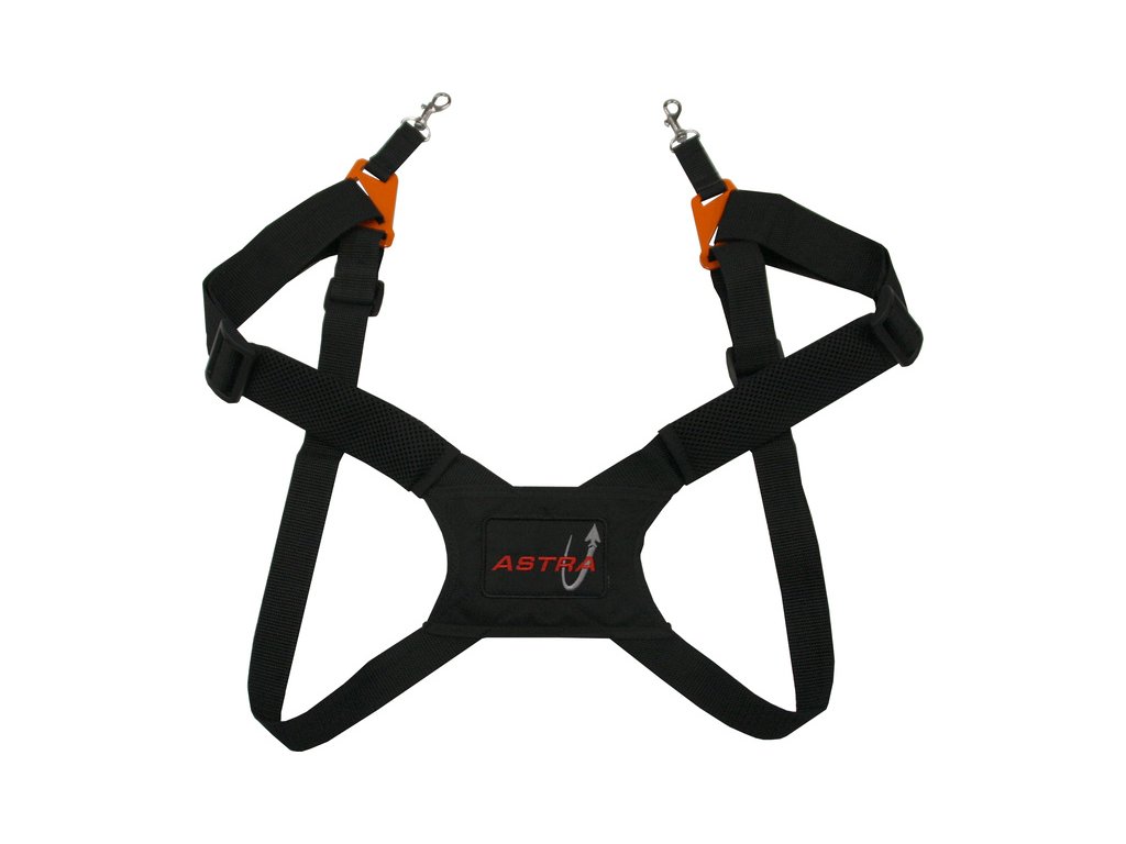 Kvalitní křížový popruh vysílače s logem Astra je z pevného materiálu, má nastavitelnou délku popruhů a poutací karabiny pro upevnění k pultu.