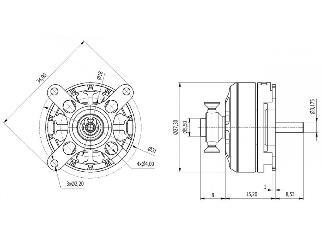 Montáž motoru: AXI 2203/RACE SAVER V2 je konstruován pro přední montáž s pomocí trojice patek na předním čelu. Motorová přepážka by měla být z 1-1,5 mm letecké překližky.