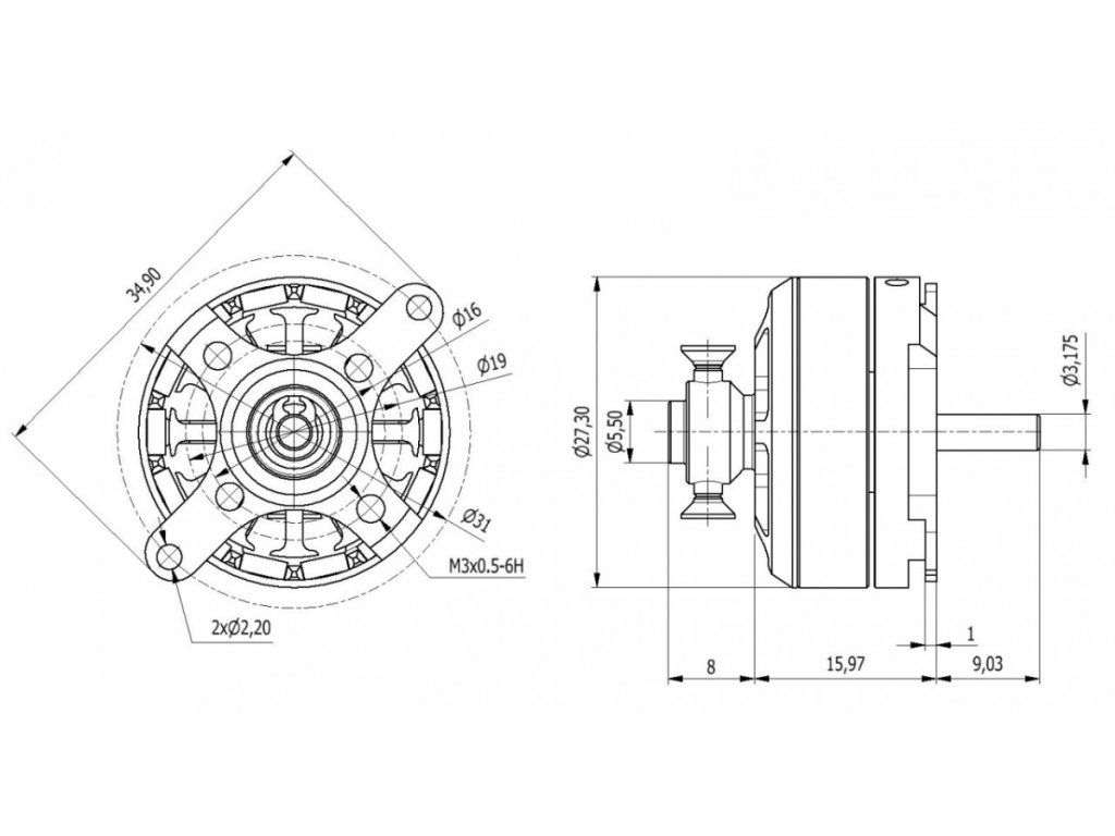 Montáž motoru: AXI 2204/54 V2 je konstruován pro přední i zadní montáž (s využitím dvojice patek na předním čele), gumičkový unašeč vhodný pro vrtule GWS je integrální součástí motoru. Osazení unašeče pro vrtuli má průměr 5,5 mm, s motorem jsou dodávány ještě dva adaptéry s průměrem osazení 7 a 8 mm. Při přední montáži za čelo motoru použijte dva (protilehlé) šrouby M3, které zasahují do čela motoru v rozmezí 2-2,5 mm. Motorová přepážka by měla být z 1-1,5 mm letecké překližky.