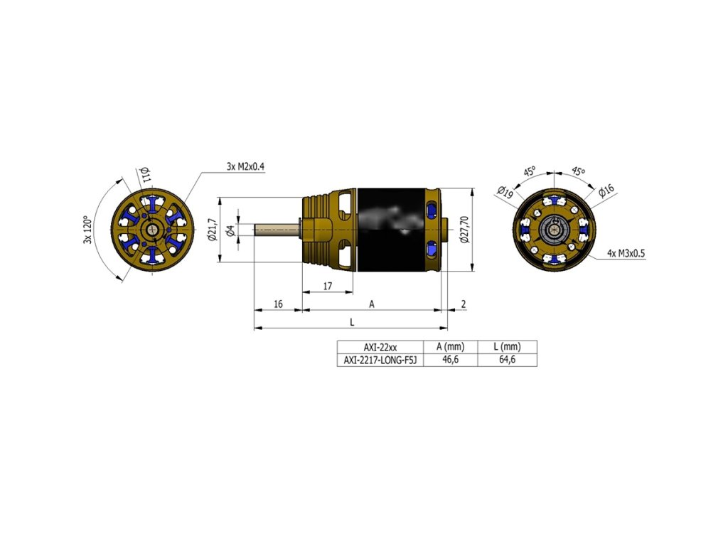 AXI 2217/12 V2 Long je střídavý motor učený pro pohon menších modelů s letovou hmotností do 1000 g s napájením z dvoučlánkového nebo tříčlánkového akumulátoru Li-poly. Výborně se hodí pro menší hotlinery, kde lépe funguje vrtule menšího průměru s vyšším počtem otáček.