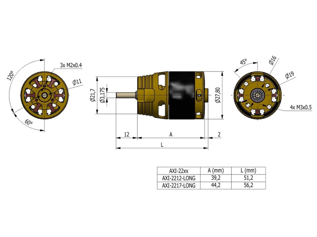 Střídavý elektromotor s rotačním pláštěm nové generace s prodlouženým kónickým předním čelem pro snadnou montáž do větroňů. Pro hotlinery 1100g, napájení Lixx 2-4s, hřídel 3,17 mm, regulátor 18-25A.