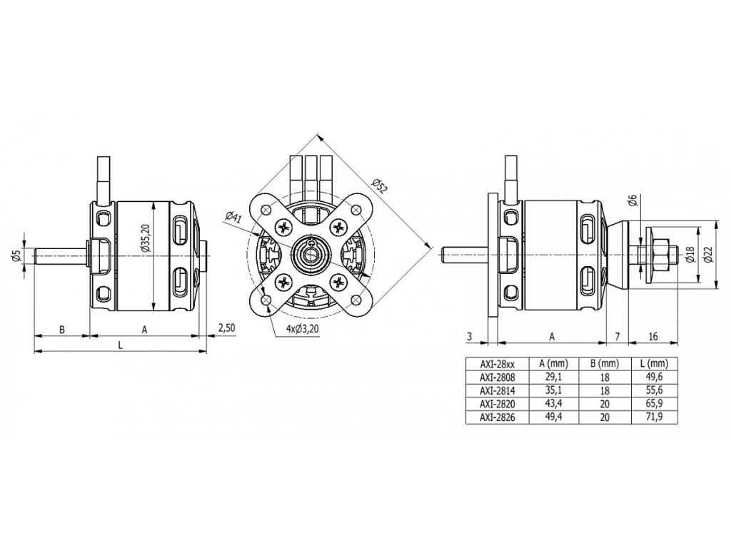 Montáž motoru: AXI 2808/16 V2 je konstruován pro přední i zadní montáž. Při přední montáži za čelo motoru použijte nejméně dva (protilehlé), nebo čtyři šrouby M3, které zasahují do čela motoru v rozmezí 3,5-4 mm. Motorová přepážka by měla být z 3 mm letecké překližky.