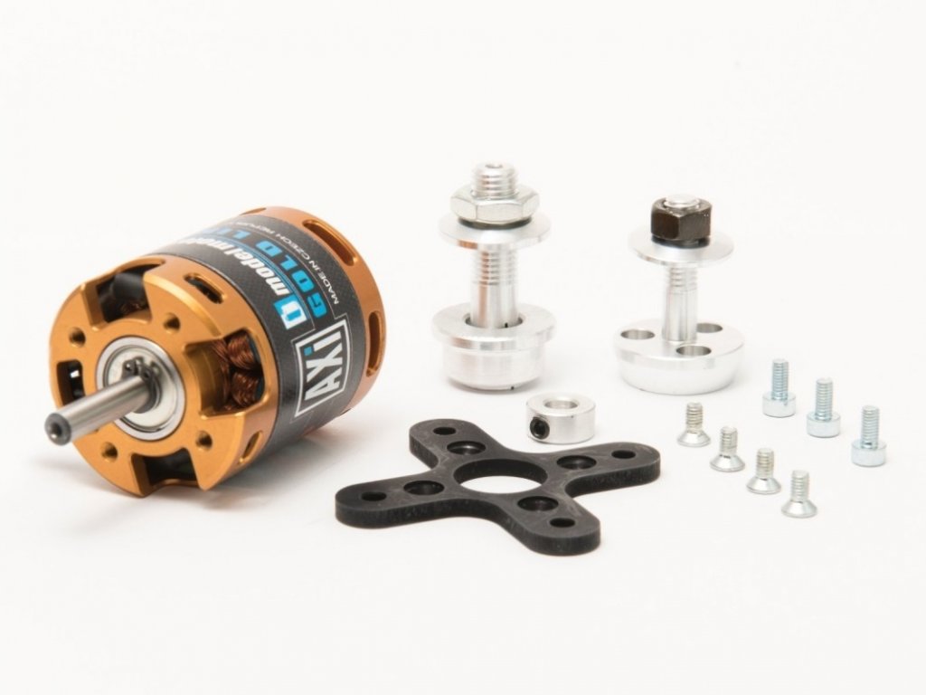 Sada motoru obsahuje: střídavý motor AXI 2820/8 V2 s kabely, kleštinový unašeč pro pevnou vrtuli, sadu pro zadní montáž, návod.