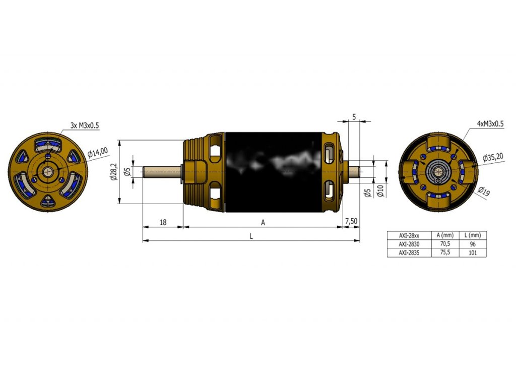 Střídavý elektromotor s rotačním pláštěm nové generace s prodlouženým kónickým předním čelem pro snadnou montáž do větroňů. Pro hotlinery do 3200g, větroně 3200g, napájení Lixx 3-6s, hřídel 5 mm, regulátor 70A.Doplňkové parametry