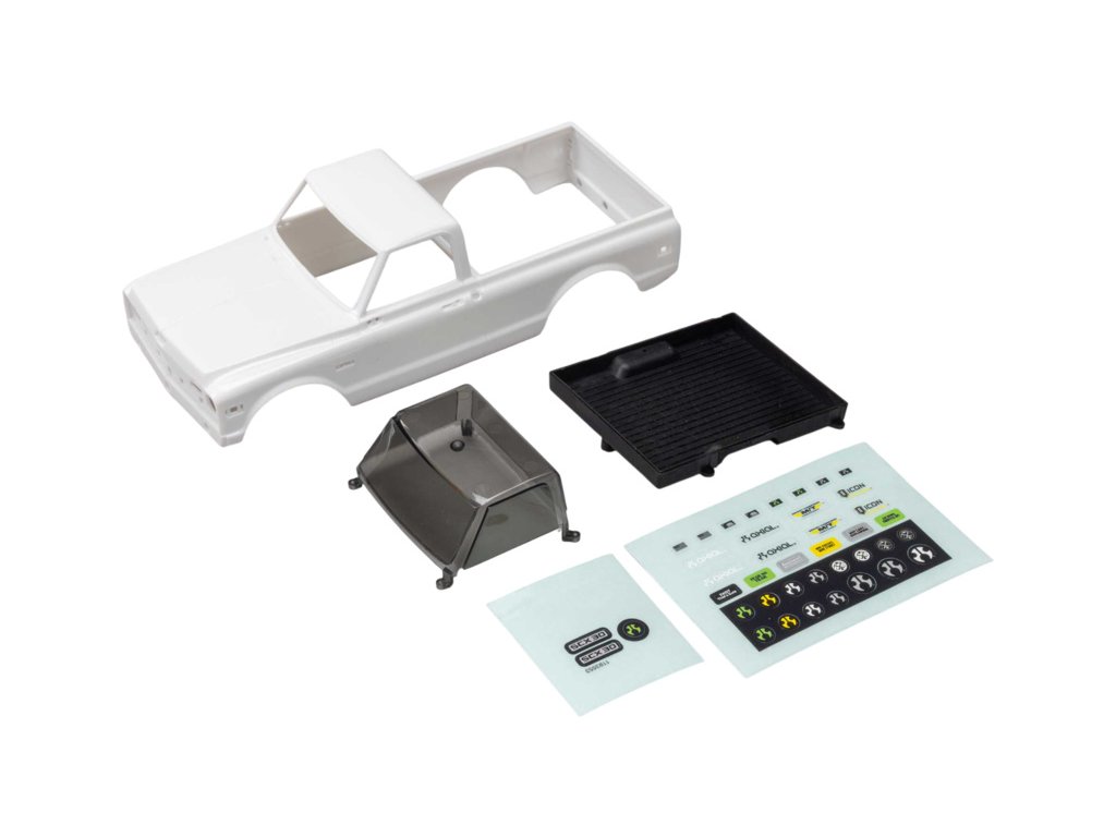 Náhradní díl pro RC model auta Axial SCX30 K10: karosérie. Vyrobeno z bílého ABS plastu. Včetně čirých oken, výplně korby a archu samolepek.