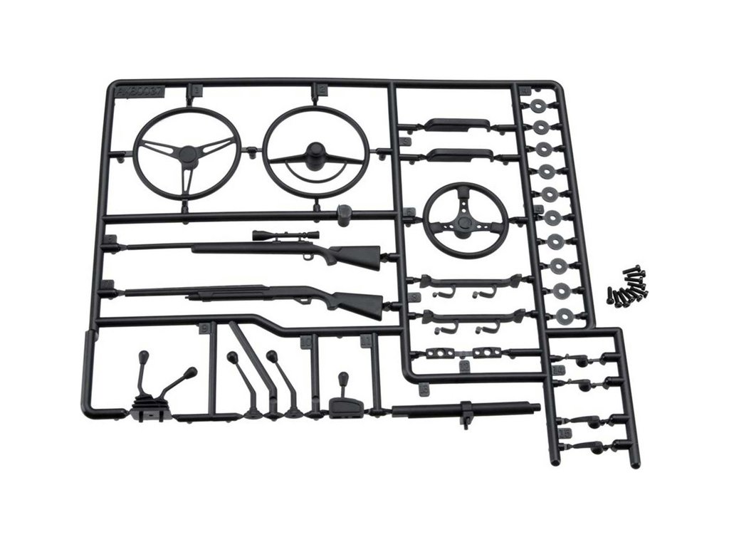 Náhradní díl pro RC modely aut Axial na podvozku SCX10 II: plastové díly interiéru, jako volanty, řadící páky, držáky ,makety pušek a další.