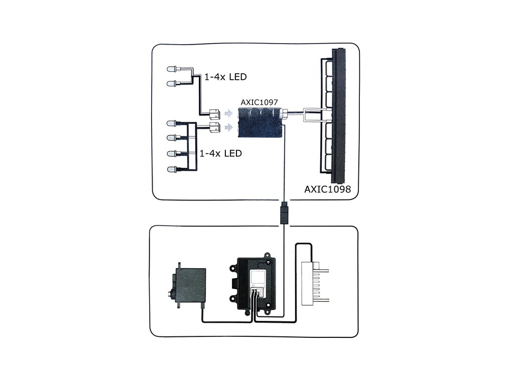 - Do prvního výstupu lze zapojit LED svazek AXIC1098 - 8 bílých LED (tyto LED lze instalovat do světelné rampy AXIC1152).