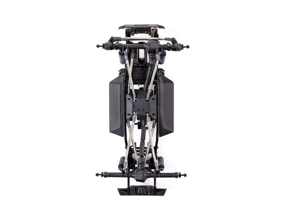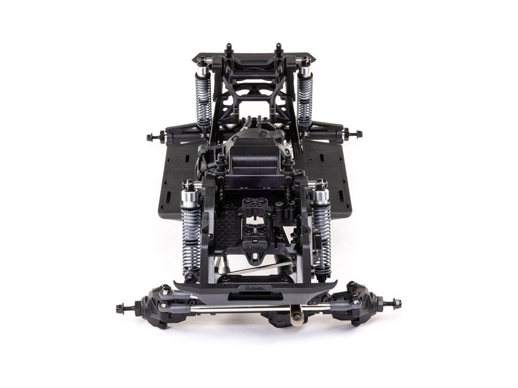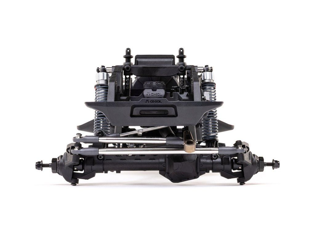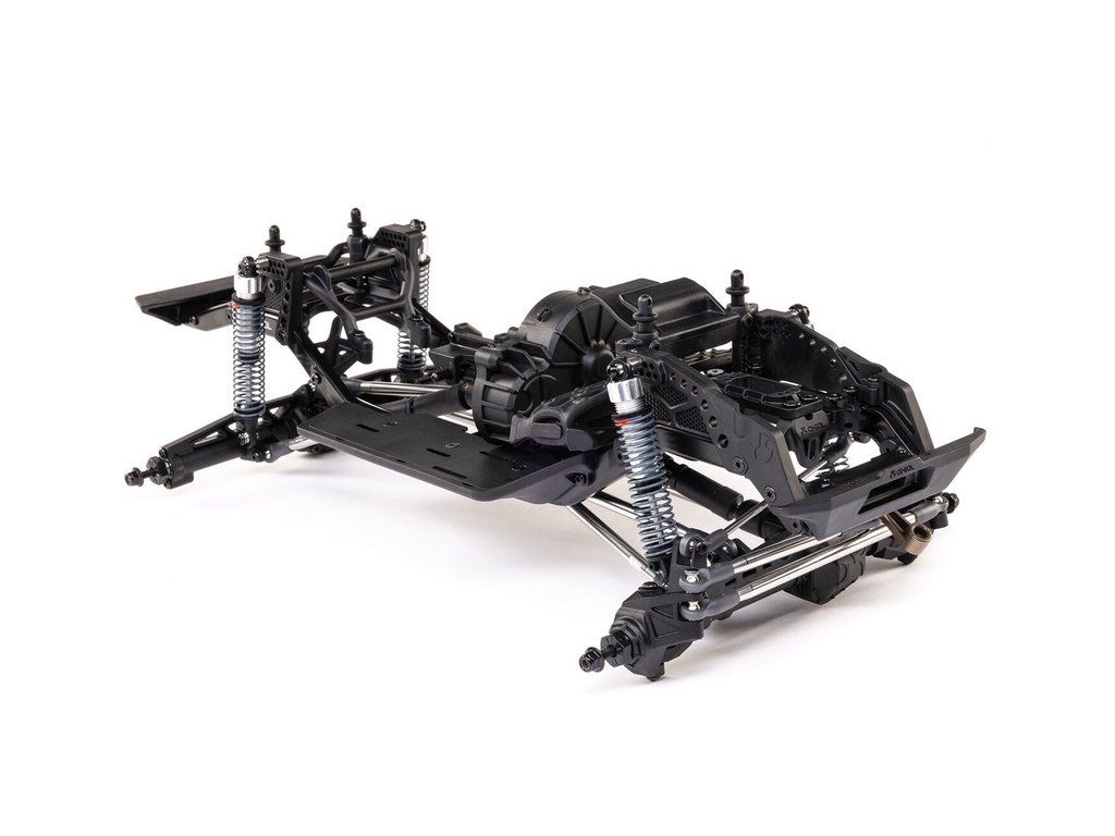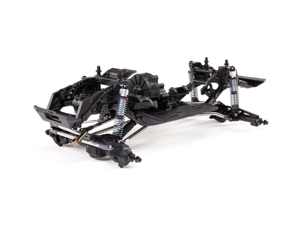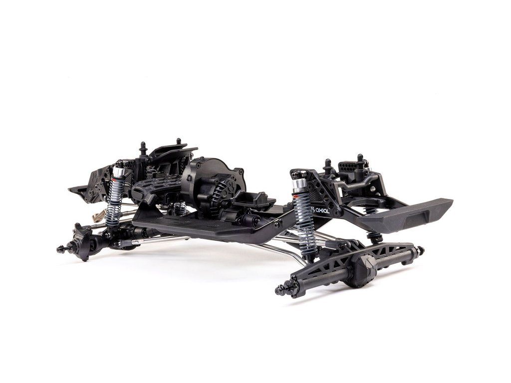 Stavebnice Axial není jen nesestavená verze RTR. Jedná se o vylepšenou verzi! Převodovka LCXU umožňuje volitelně instalovat speciální funkci pro crawlery DIG (zablokování zadní nápravy). Táhla zavěšení jsou 6 mm z nerezové oceli. Nové výkonné věže tlumičů vám nabízejí několik možností montáže pro optimalizaci odpružení. Namontujte tlumiče svisle pro lineární odpružení nebo je nakloňte pro progresivní tlumení a nižší těžiště. Dále jsou použity přímé nápravy AR45 a tři nastavitelné přihrádky pro akumulátory poskytují velkou variabilitu napájení a nastavení těžiště. Úchyty Panhard tyče umožňují i instalaci portálových náprav (prodávají se samostatně). Konstrukce podvozku je tříbodová přední s Panhardskou tyčí a čtyřbodová zadní. Toto zavěšení poskytuje velký výkyv náprav a přesnou geometrii. Instalovány jsou šikmé podvozkové prahy, díky kterým můžeme model hladce sklouznout po překážce.